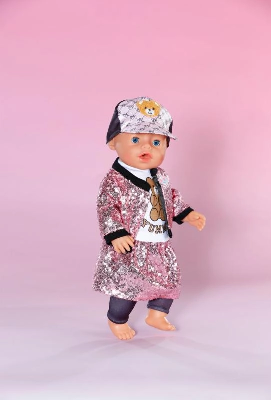 Dale a tu muñeca o al osito BABY born Teddy un estilo único con este conjunto brillante de ropa para tamaño 43 cm. El set incluye una chaqueta rosa con lentejuelas, falda, camiseta con estampado de osito, gorro y leggings – ideal para un juego creativo y duradero. También incluye una percha de material reciclado para un juego más sostenible.