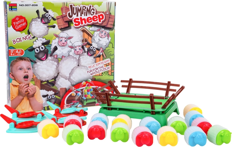 Las ovejitas tienen superficie con velcro, por lo que tras caer pueden pegarse en pilas estables. El set es compacto, ligero e ideal para la mesa: perfecto para el desarrollo de habilidades y la diversión en familia.