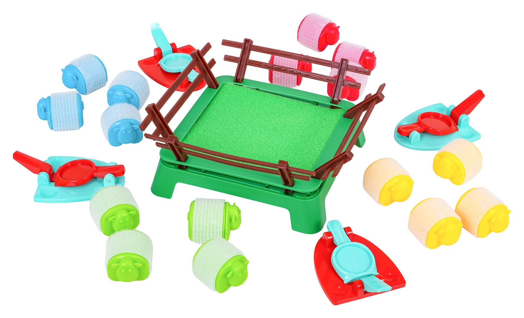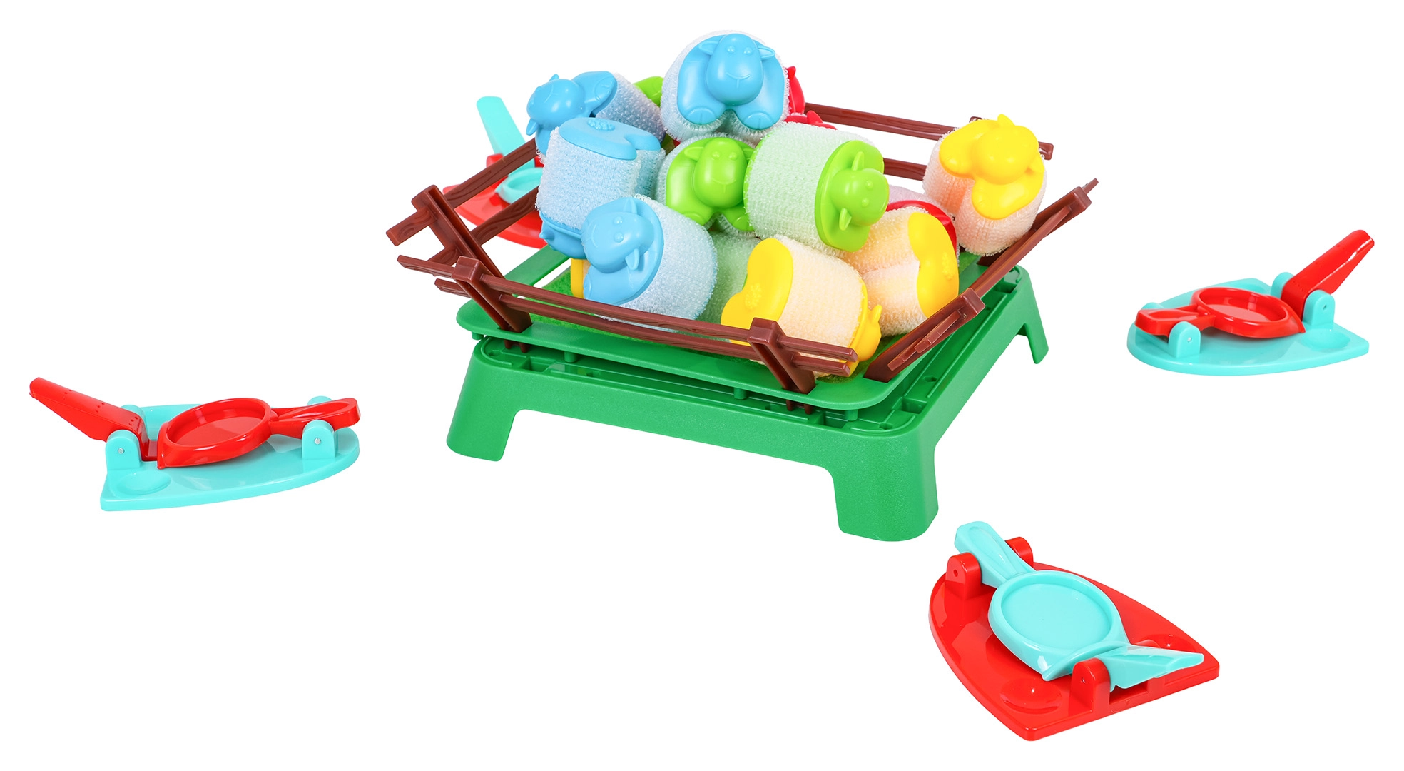 - 16 ovejitas de colores, 4 lanzadores, corral, manual (EN)
