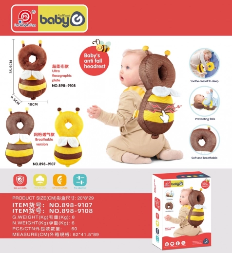 Descubre un práctico ayudante para la etapa de aprendizaje de la marcha. Este cojín protector con forma de abeja amortigua las caídas y ayuda a proteger la cabecita del niño de los golpes. Gracias a su bajo peso y diseño ergonómico, no limita el movimiento y el niño puede llevarlo sin dificultad como una pequeña mochila.