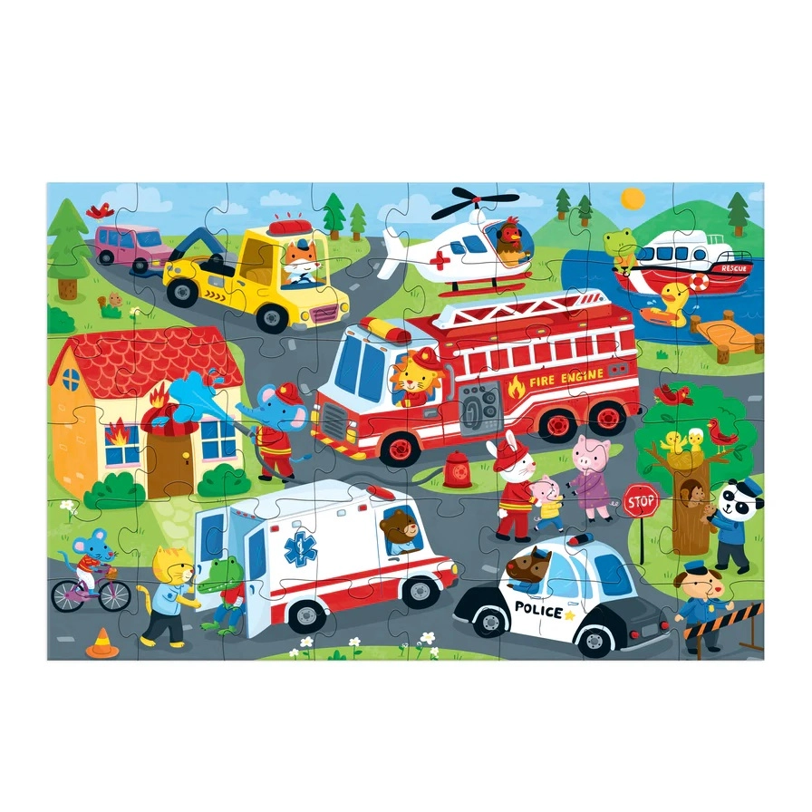 Descubre un rompecabezas de suelo divertido y educativo con temática de vehículos de rescate. Incluye 48 piezas grandes ideales para manos pequeñas, fabricadas con papel reciclado, tintas inocuas y acabado mate para colores y detalles fieles. Forma parte un imagen guía y una caja resistente de cartón reciclado.