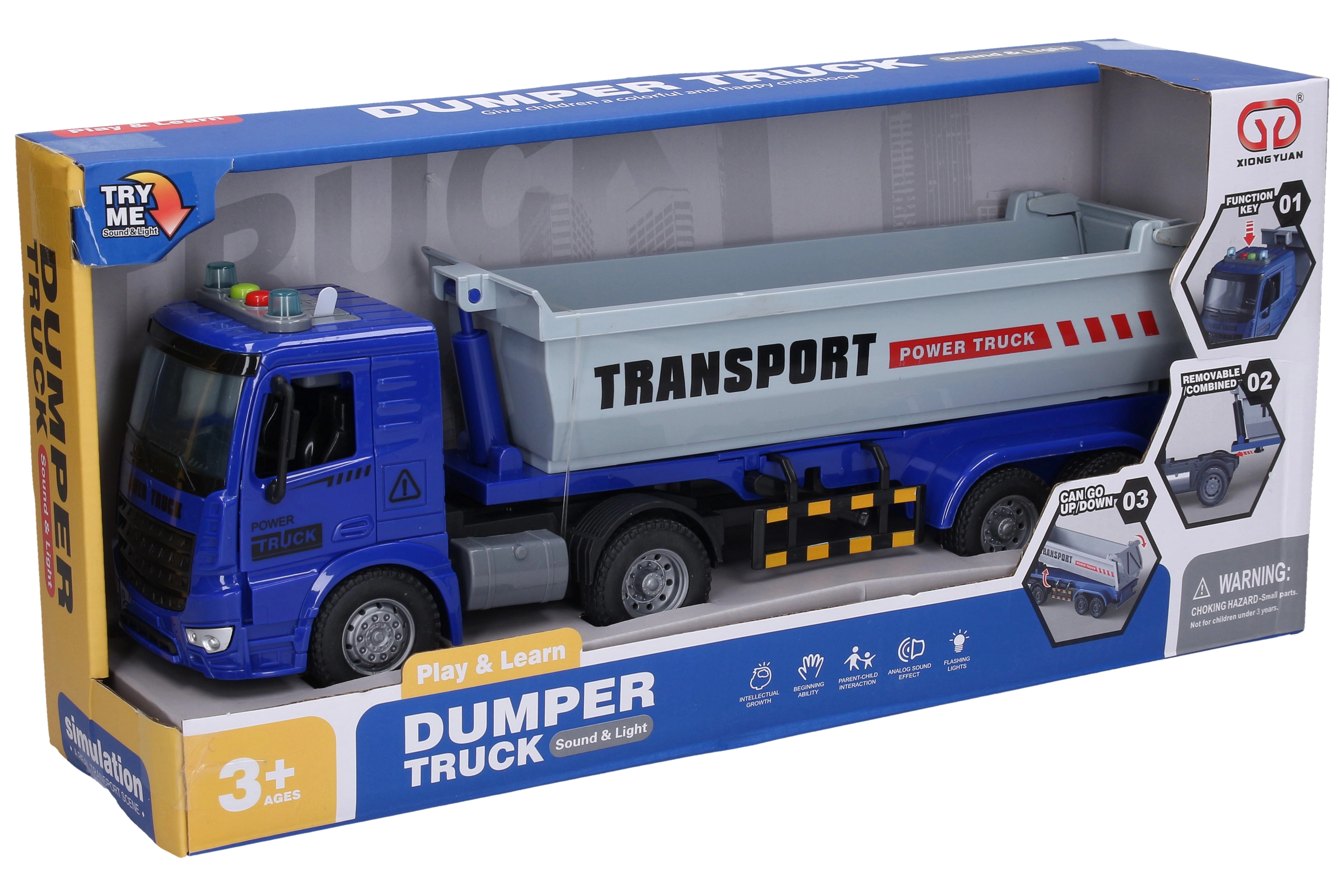 Solo hay que pulsar: el botón 1 activa el sonido del motor y el basculado, el botón 2 activa el sonido de marcha atrás y el claxon. El remolque desmontable amplía las posibilidades de juego: conduce con remolque o sin él. Las pilas están incluidas en el paquete, así que la diversión puede comenzar de inmediato.