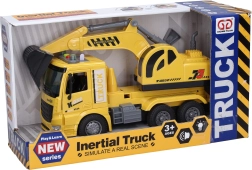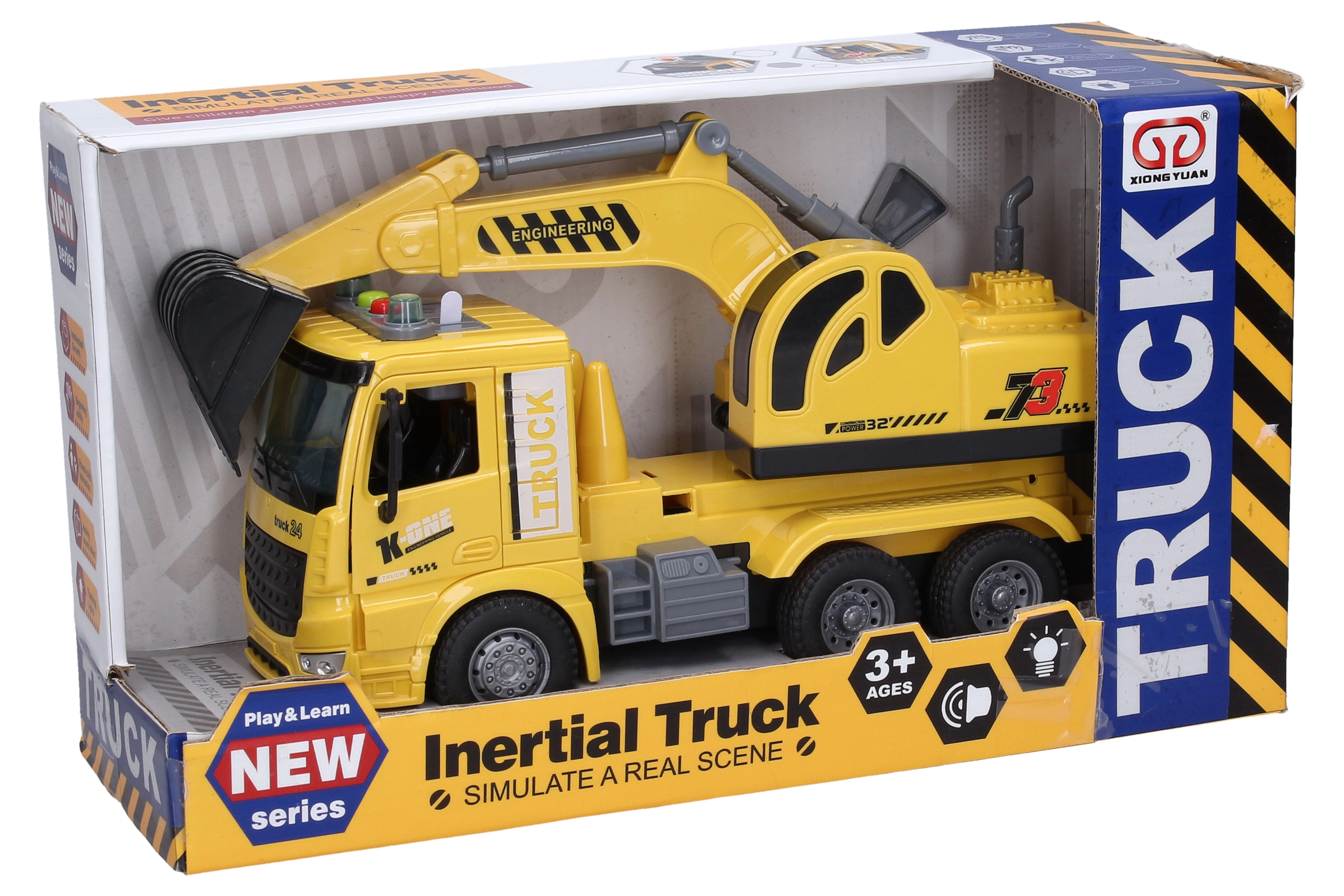 Esta excavadora de construcción, detalladamente elaborada y de 28 cm de largo, es el juguete ideal para todos los pequeños fans de la maquinaria de obra. La propulsión por inercia garantiza un desplazamiento fluido, mientras que los botones en el techo activan sonidos realistas de motor, excavación, marcha atrás y bocina acompañados de efectos luminosos.
