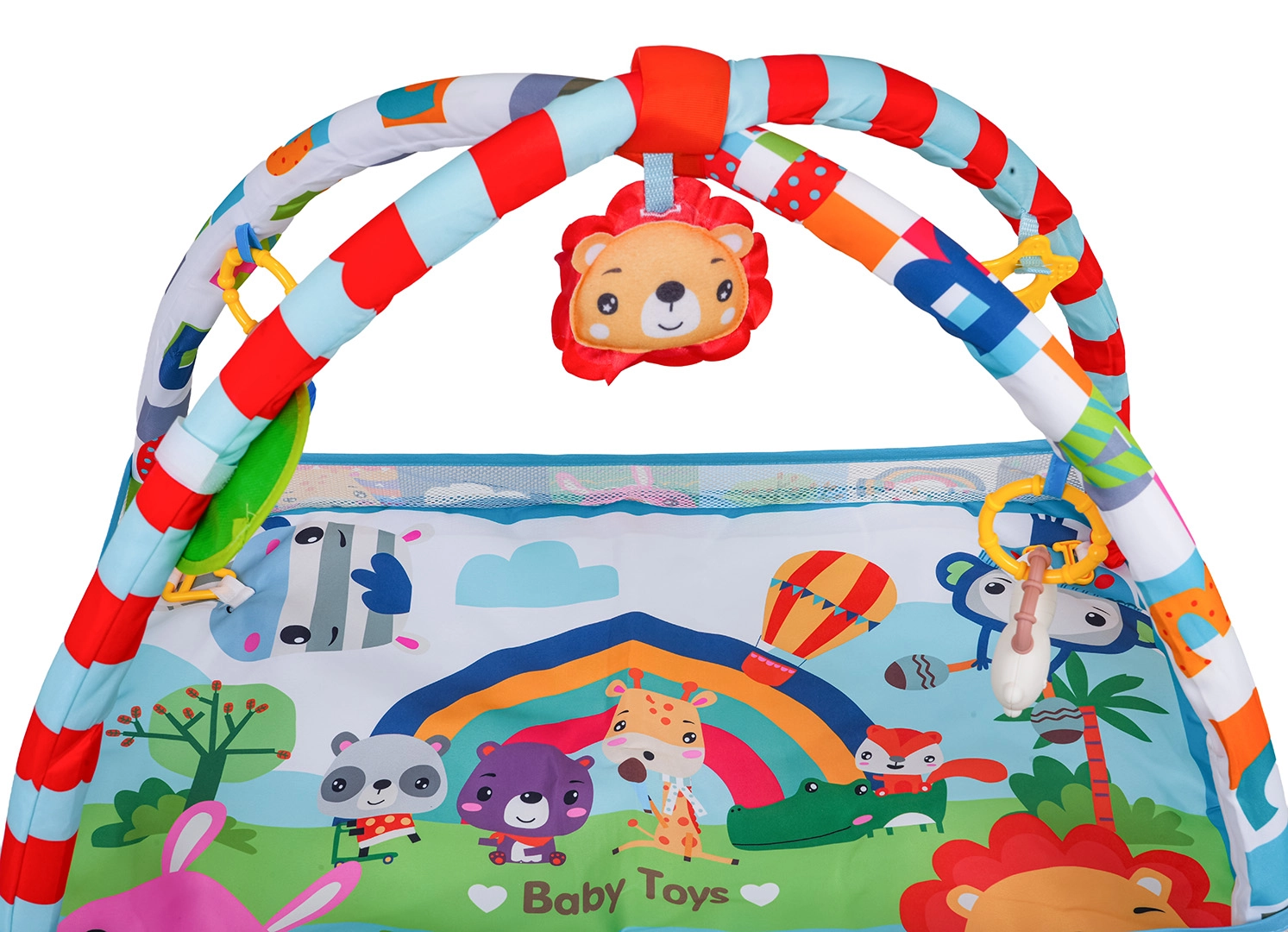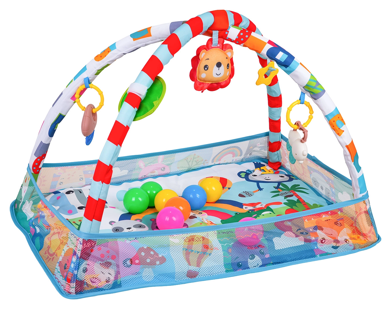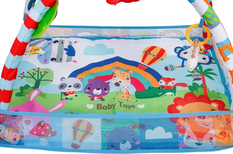 El arco desmontable con juguetes colgantes (espejo seguro, juguetes con sonajeros y mordedores, león de peluche con silbato, etc.) anima al niño a estirarse, agarrar y explorar. La base está hecha de materiales seguros y fáciles de limpiar, con colores vivos y una estructura estable para el juego diario.