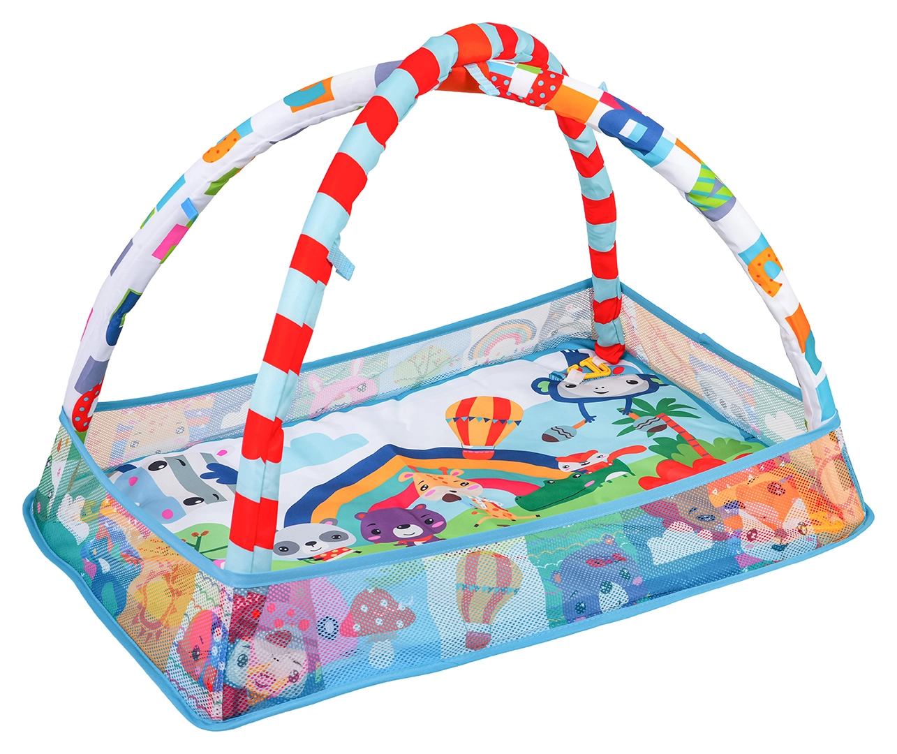 Esta colorida manta de juego crea un entorno seguro y estimulante para el desarrollo sensorial y motor desde los primeros días. Gracias a los laterales de malla, mantiene los juguetes y pelotas en su lugar y ofrece al bebé un espacio tranquilo para descansar boca arriba y para tummy time.