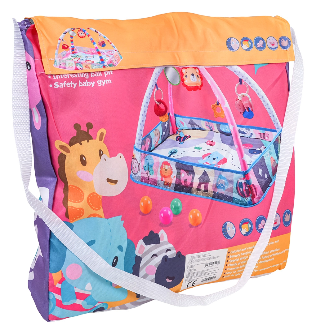 En el paquete: alfombra con juguetes colgantes, 8× pelotas de plástico para la piscina seca y bolsa bandolera de colores para facilitar el transporte y almacenamiento.