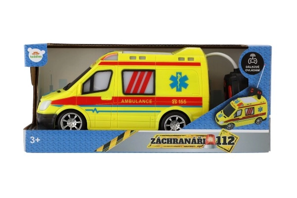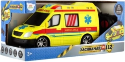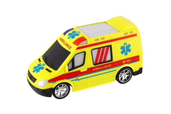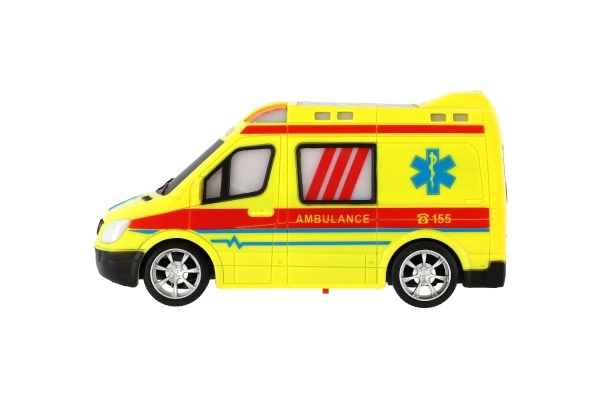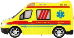 Ambulancia amarilla llamativa con detalles de AMBULANCE y luz funcional para fomentar el juego creativo de los pequeños rescatistas.