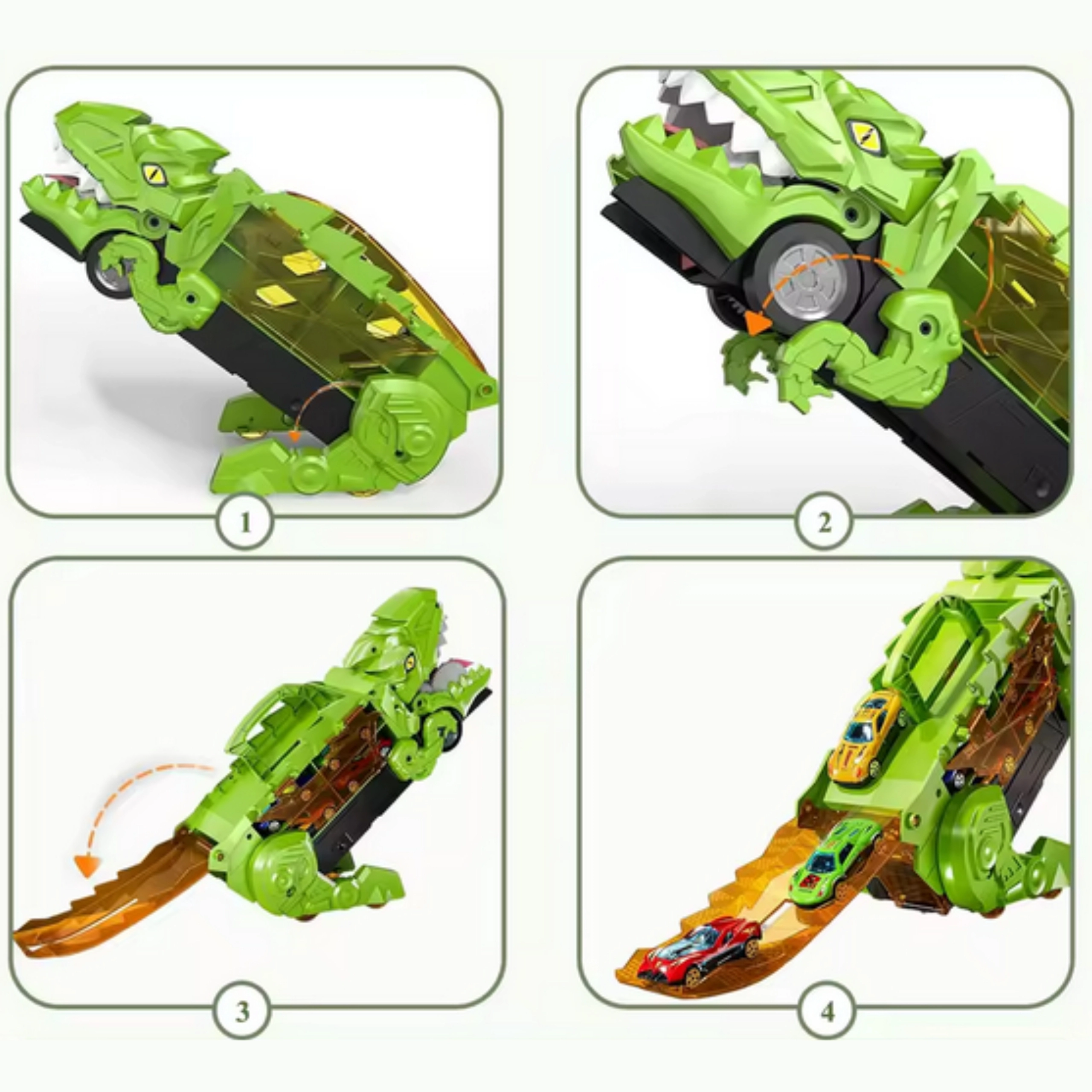 Abre la cabeza del dinosaurio y despliega el tobogán naranja. Los cochecitos saldrán con fluidez y la carrera puede comenzar.