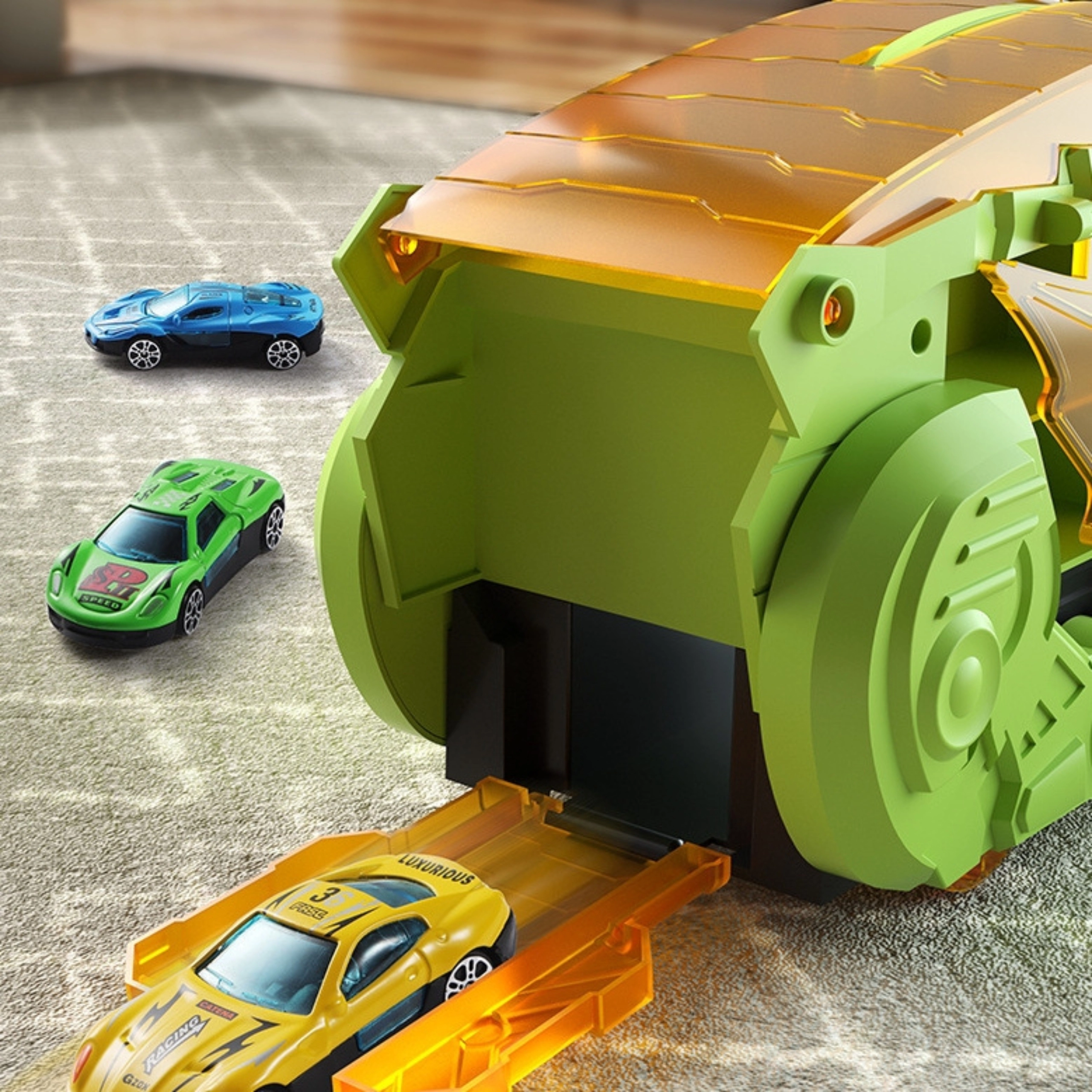 El tráiler dinosaurio se convierte en un campo de juego en un instante: despliega la rampa naranja, carga los cochecitos y déjalos salir por la boca abierta del dinosaurio. Gracias a la práctica asa y a los compartimentos internos, guardarás todos los vehículos con facilidad y te los llevarás donde quieras. Los colores vivos y los detalles llamativos estimulan la imaginación e invitan al juego.
