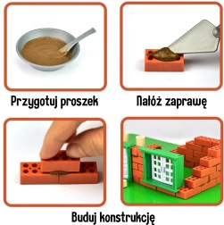 El manejo es sencillo: mezcla el polvo con agua 1:1, aplica la mezcla con la espátula y coloca los ladrillos capa por capa. La casa terminada puede sumergirse en agua tibia durante 1–3 horas para reutilizarla: la mezcla se disuelve y las piezas pueden usarse de nuevo. Las herramientas infantiles incluidas enseñan los movimientos correctos y desarrollan la motricidad fina.