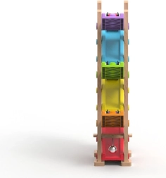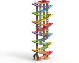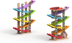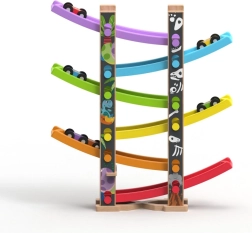 La estructura de madera estable, la alta calidad de fabricación y los materiales seguros garantizan una larga vida útil. Jugar con la pista desarrolla la motricidad fina, la coordinación mano–ojo, la concentración y el pensamiento lógico. El montaje sencillo se realiza en un momento: las carreras pueden comenzar.