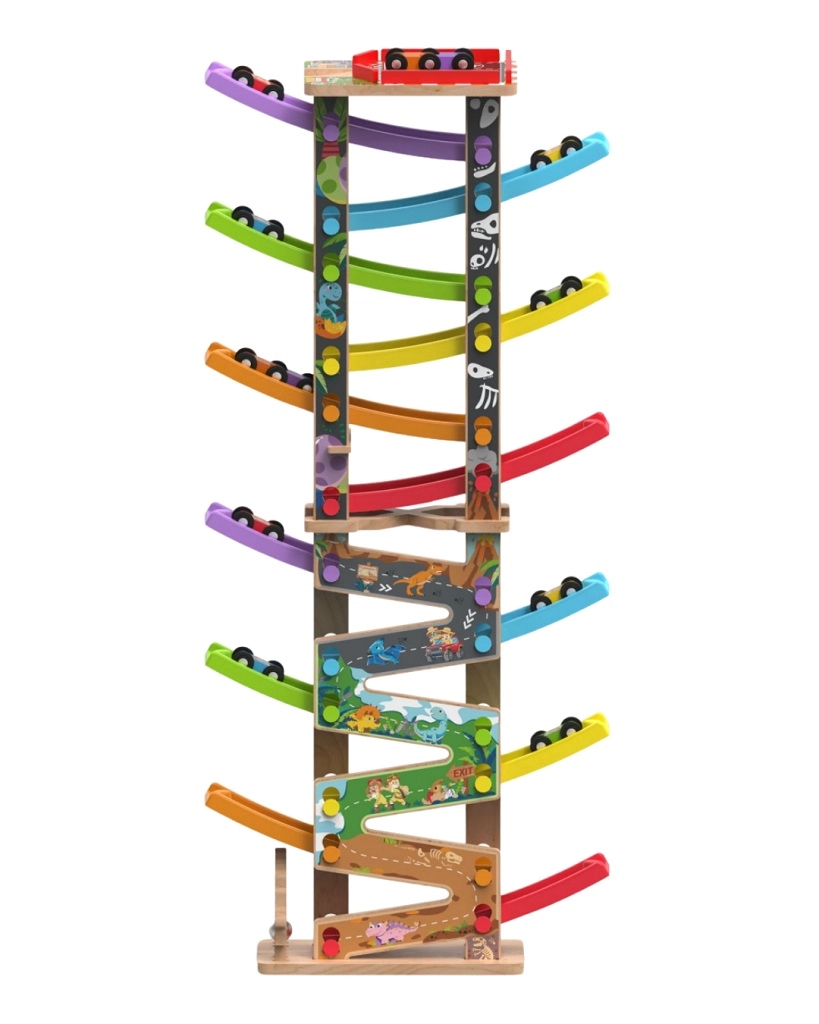 Observa cómo los cochecitos descienden por la cascada de pistas de colores. Más niveles significan un recorrido más largo, más diversión y un gran efecto visual.