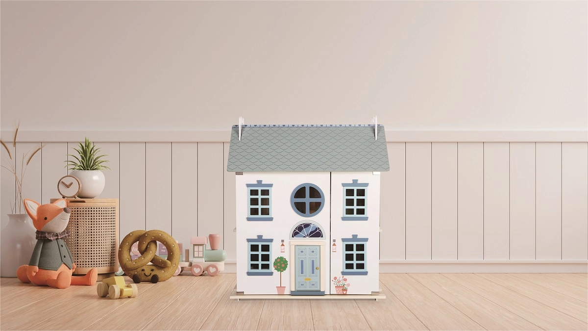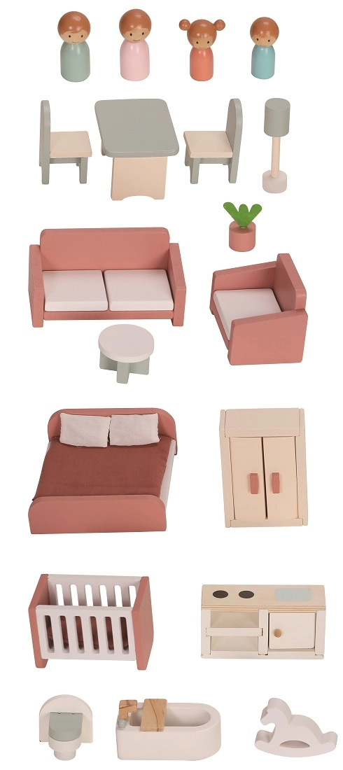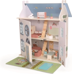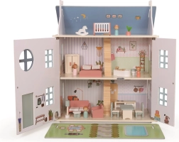 La casita está hecha de madera de calidad y complementada con elementos textiles y de fieltro. Incluye muebles y figuritas, por lo que los niños pueden empezar a jugar de inmediato. Los paneles abatibles facilitan el acceso al interior y los estampados detallados de las habitaciones fomentan el juego realista. La estructura robusta garantiza una larga vida útil y un uso seguro.
