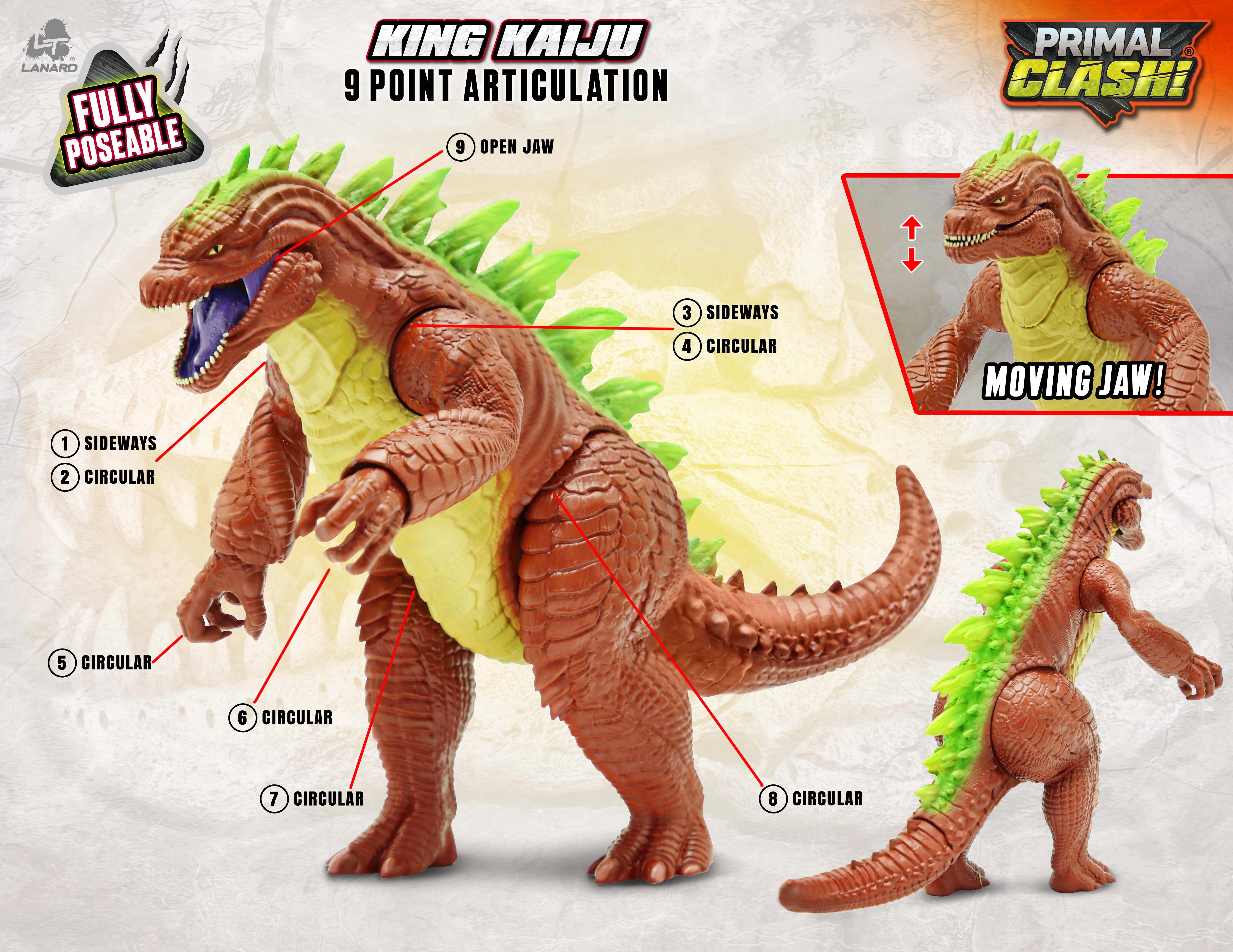 Entra en el mundo de los monstruos con la imponente figura King Kaiju de la línea Primal Clash. Las escamas detalladas, la coloración contrastada y las llamativas espinas dorsales aportan un aspecto auténtico y feroz. Gracias a las extremidades, la mandíbula y la cola móviles, la figura se puede posar fácilmente para escenas de combate dinámicas o para una exhibición estática.
