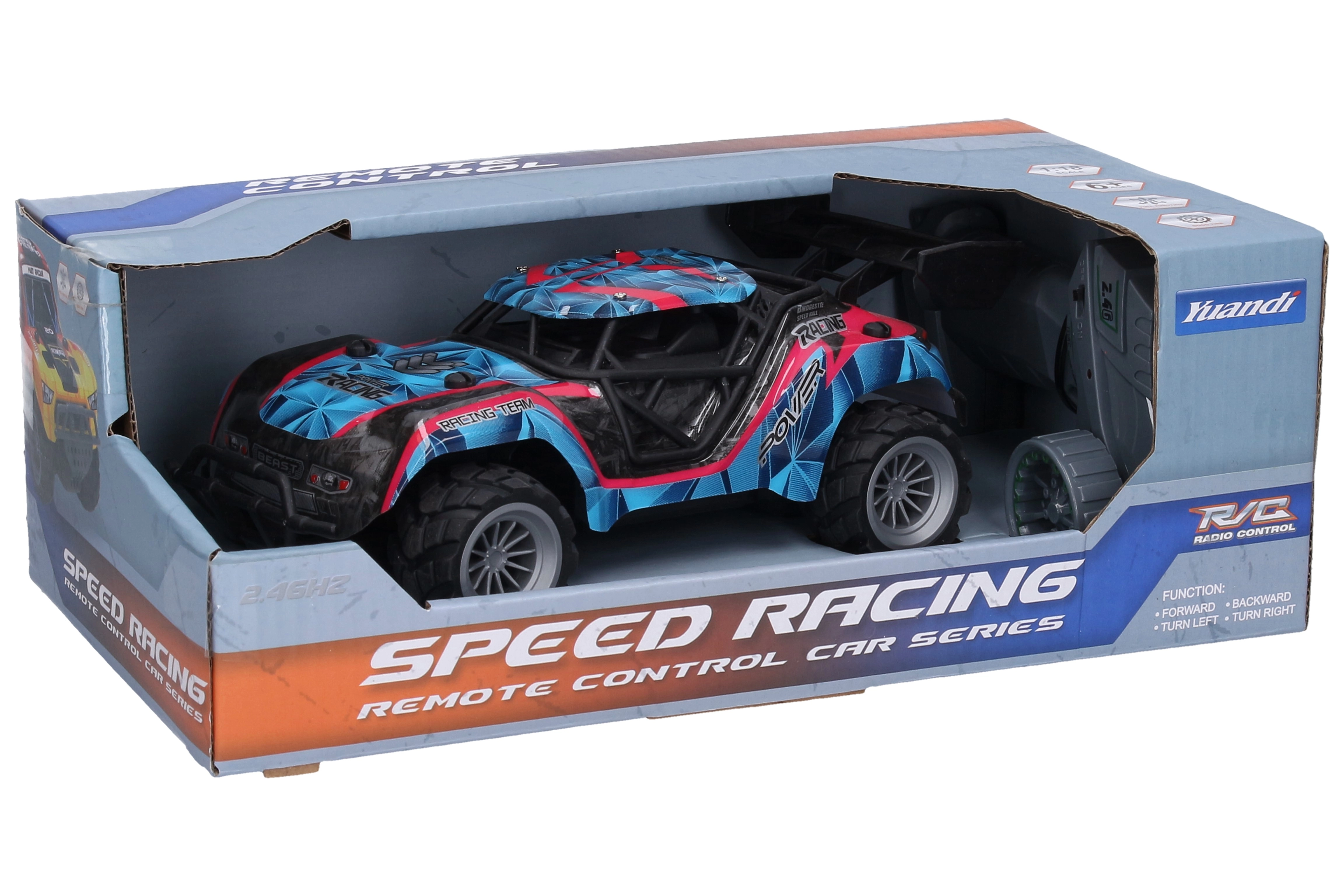 Esta buggy RC compacta es una excelente opción para principiantes y pequeños corredores. La transmisión estable a 2,4 GHz permite conducir varios modelos al mismo tiempo, mientras que el mando tipo pistola ofrece un control intuitivo y preciso. El práctico interruptor ON/OFF está situado en la parte inferior de la buggy y también en el mando.