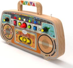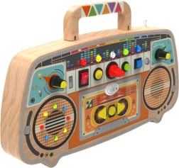 Este original activity board de madera con estilo de radio retro combina la escucha real de emisoras FM con un juego interactivo. Los niños pueden girar perillas, accionar palancas, mover deslizadores y observar las luces de colores del panel LED. Así obtienen una experiencia estimulante que desarrolla la coordinación mano–ojo, el oído musical y la percepción de colores y formas.
