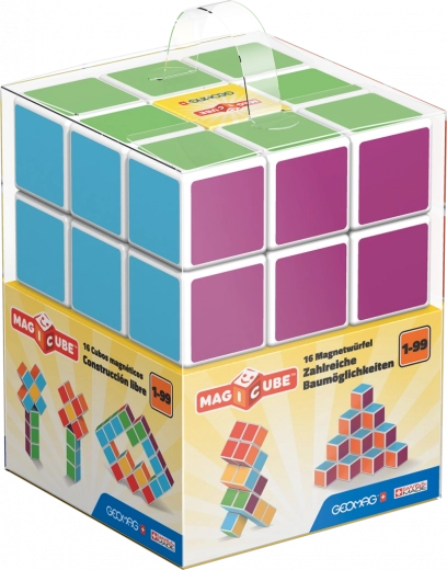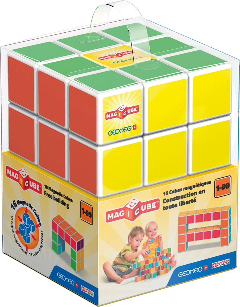 Construye, explora y aprende con los coloridos cubos magnéticos Geomag Magicube. Gracias a su diseño único, los cubos se atraen por todos los lados, ofrecen infinitas posibilidades de construcción y fomentan la motricidad fina, la imaginación espacial y el pensamiento lógico. Cada cara tiene un color distinto, lo que convierte a los cubos en una excelente herramienta educativa para casa y escuela. El set incluye 16 cubos magnéticos fabricados en Suiza con plástico reciclado, aptos a partir de 1 año.