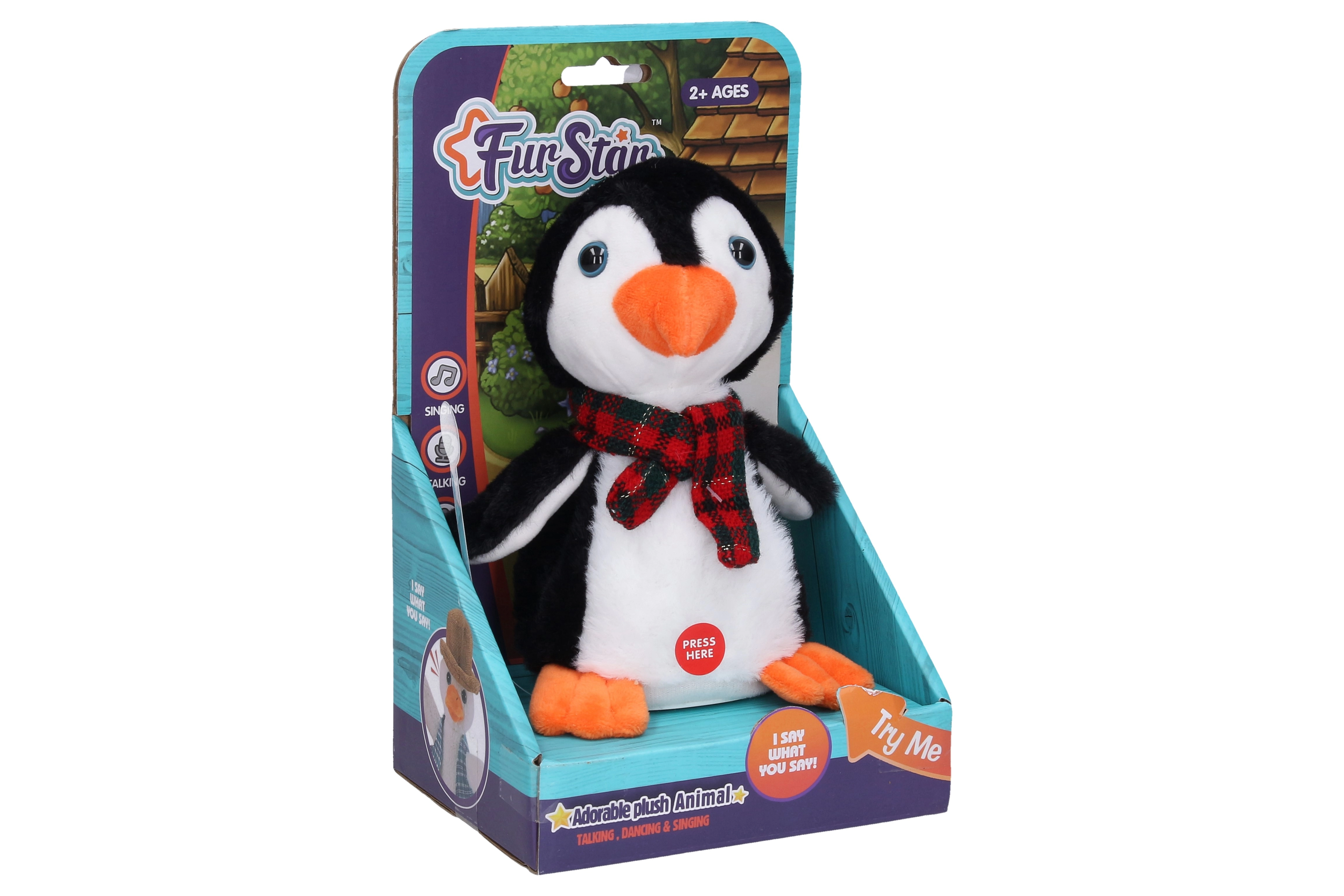 Adorable pingüino interactivo que repite lo que dices y además baila y canta. Ofrece divertidos efectos de sonido, manejo sencillo con un botón en la barriguita y un interruptor OFF/TRY ME/PLAY. Regalo ideal para niños que aman la música y la risa.