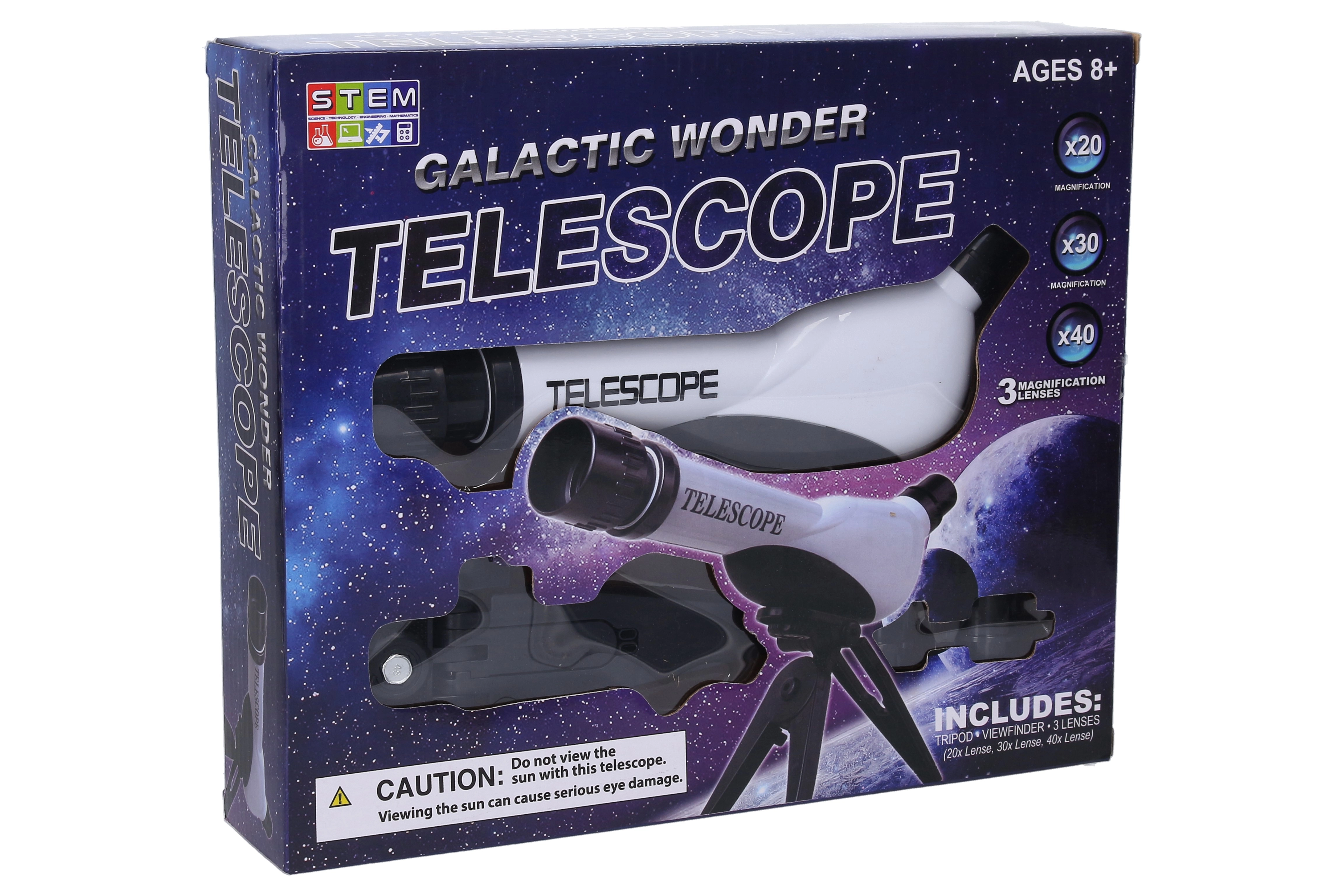 Descubre el cielo nocturno con este telescopio astronómico compacto para principiantes y niños curiosos. Ofrece aumentos de 20×, 30× y 40×, lentes intercambiables para distintos niveles de acercamiento y un trípode estable para una observación cómoda. El enfoque girando el objetivo facilita obtener una imagen nítida, que al mirar a través del telescopio aparece invertida en espejo (propiedad óptica).