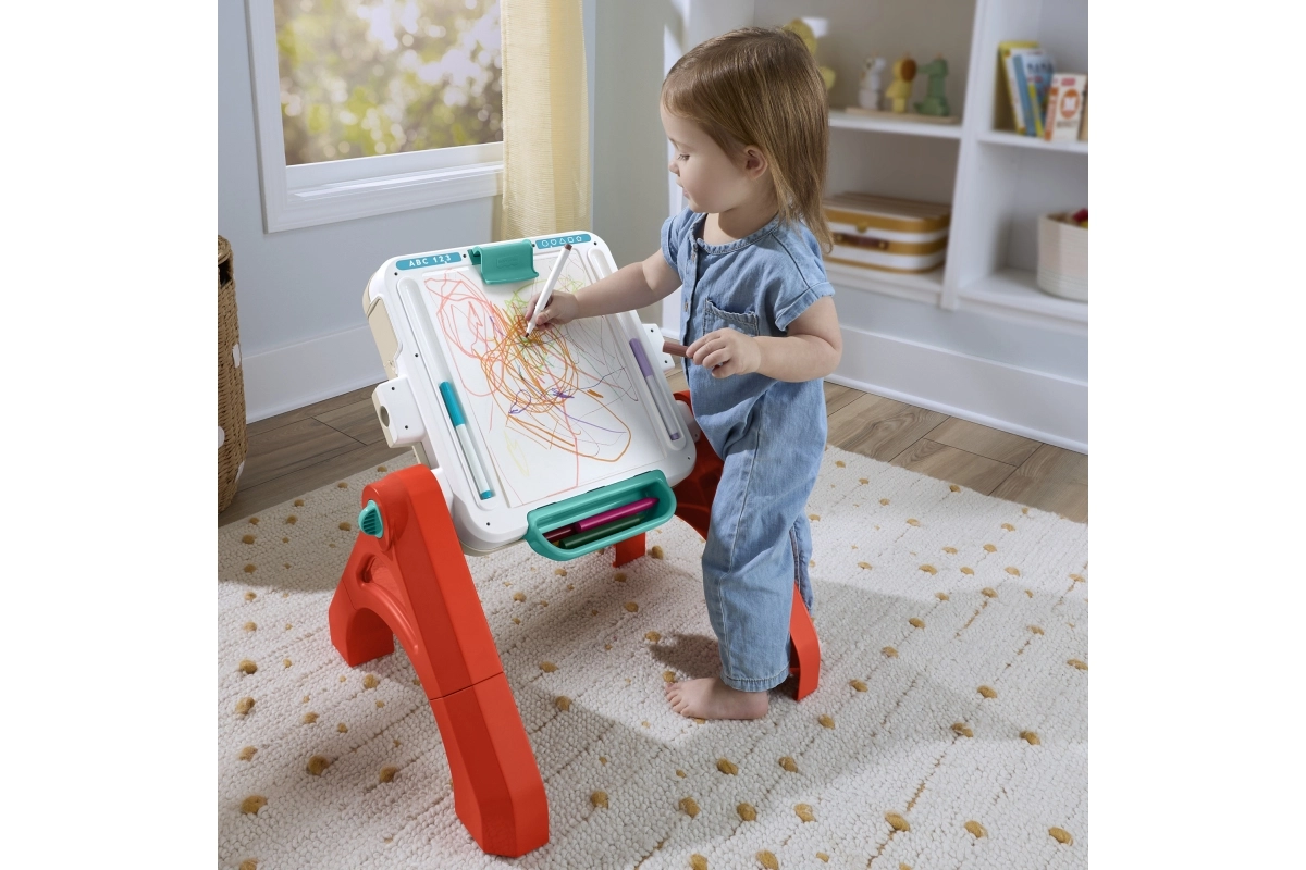 Desde sentarse hasta ponerse de pie y pasar a crear de forma independiente. La mesa se transforma fácilmente en mesa abierta o en caballete de pie para pequeños artistas.