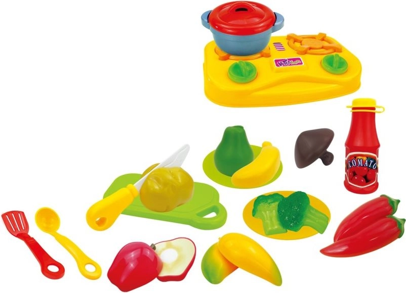 - Contenido del set: mezcla de frutas y verduras, piezas para cortar con velcro, accesorios; en total 17 uds