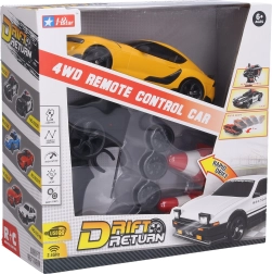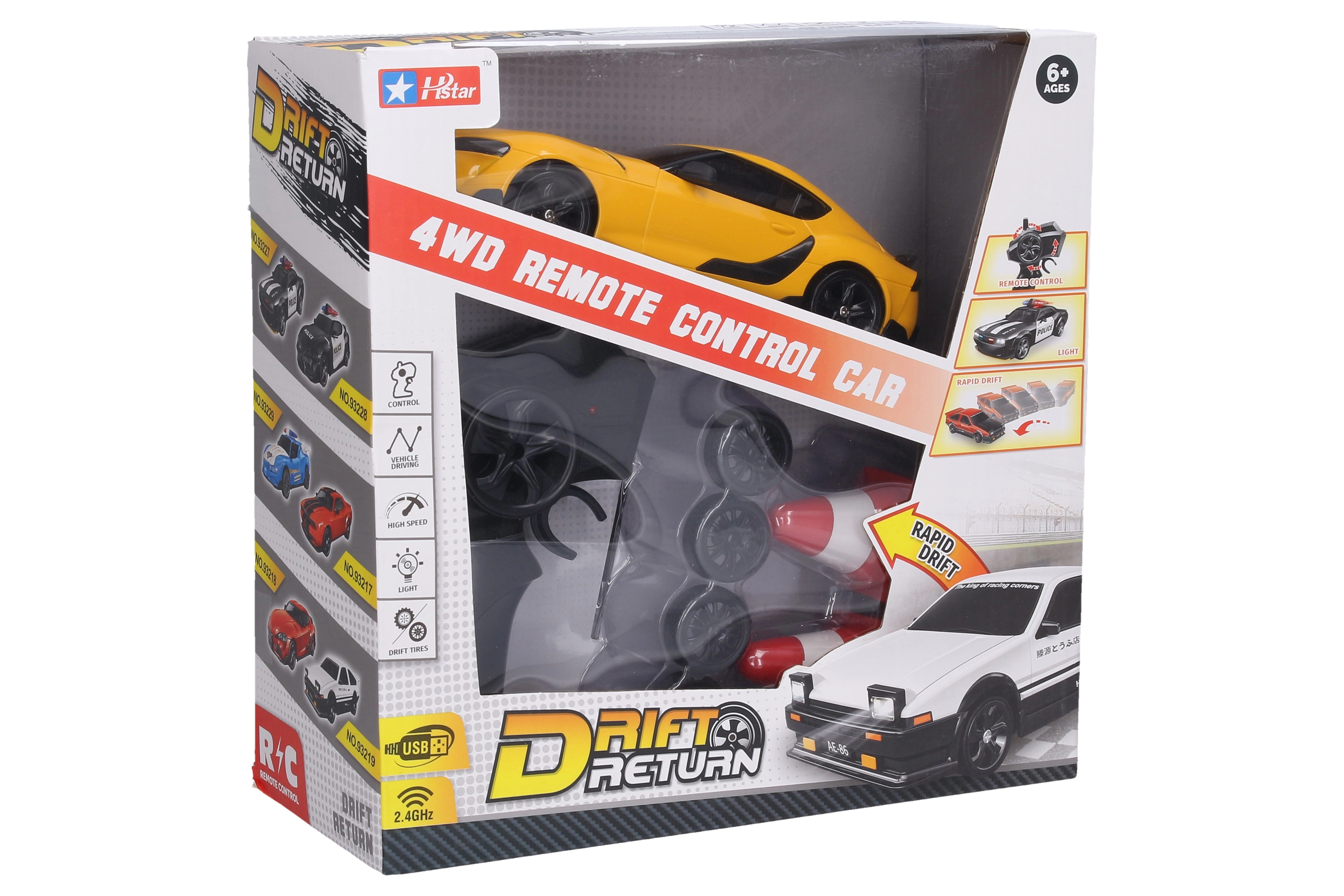 Divertido coche RC para amantes del derrape y la conducción rápida. Ofrece control de 2.4GHz, mandO tipo pistola, ruedas de derrape y estándar intercambiables, efectos de luz y hasta 20 minutos de funcionamiento por carga.
