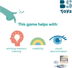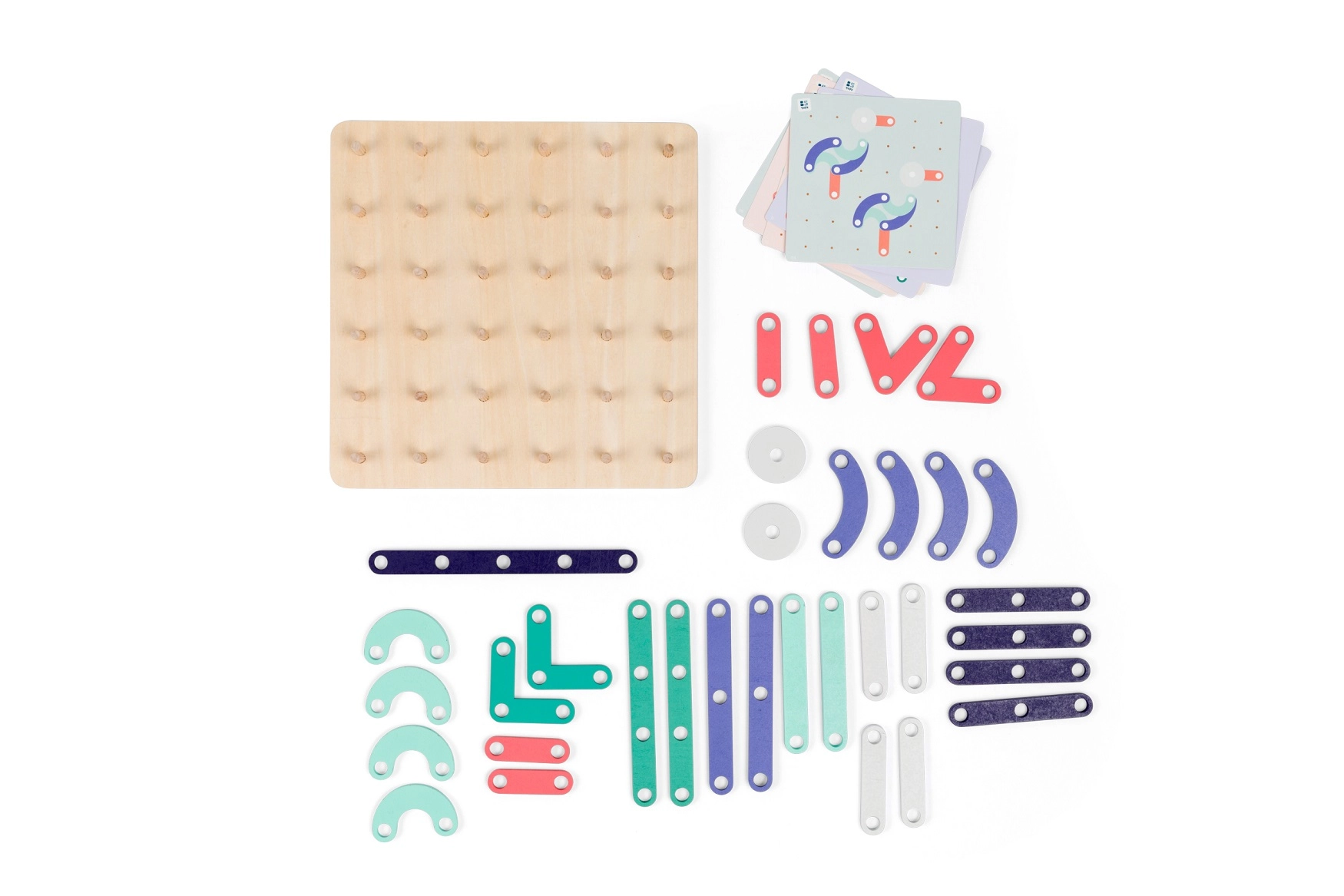 - base de madera de 21 × 21 cm, 6 tarjetas con 12 patrones (10 × 10 cm), 33 piezas de madera