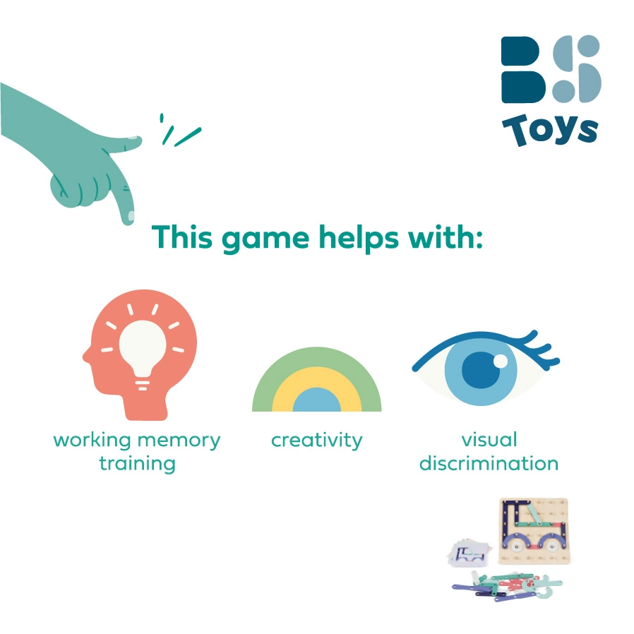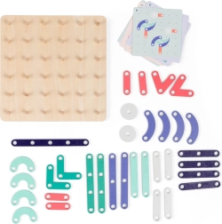 GEOPLANK es un juego creativo que fomenta la curiosidad natural de los niños. Gracias a las piezas de madera de colores, los niños pueden crear imágenes originales, copiar motivos de las tarjetas o inventar sus propias composiciones. El juego desarrolla la percepción visual, el pensamiento lógico y la coordinación ojo–mano.