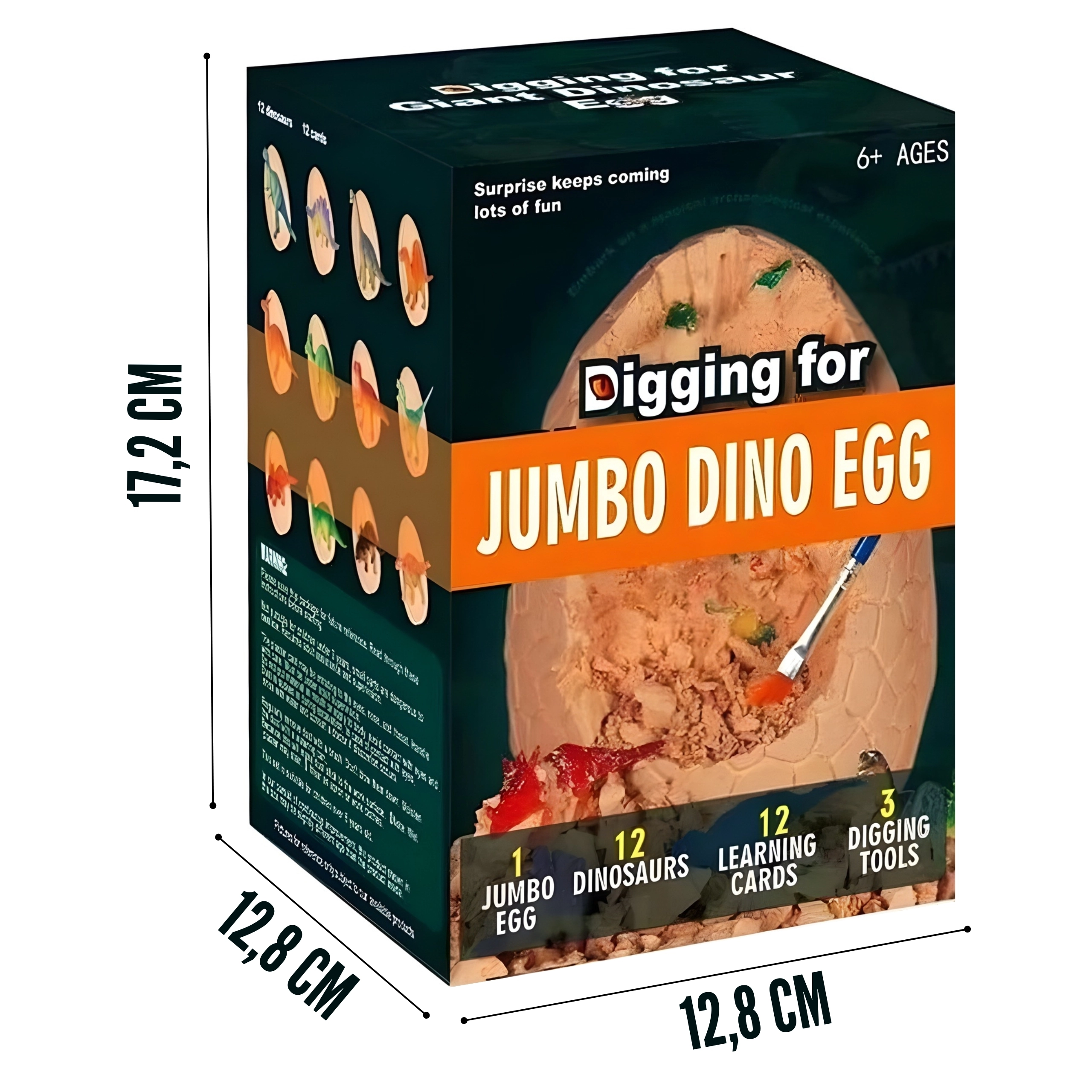 En la caja encontrarás todo lo necesario: un pequeño martillo, un cincel y un pincel para una excavación segura, así como 12 tarjetas con la descripción de los dinosaurios para un aprendizaje sencillo. Una gran idea de regalo y una actividad para diversión familiar compartida y juegos con amigos.