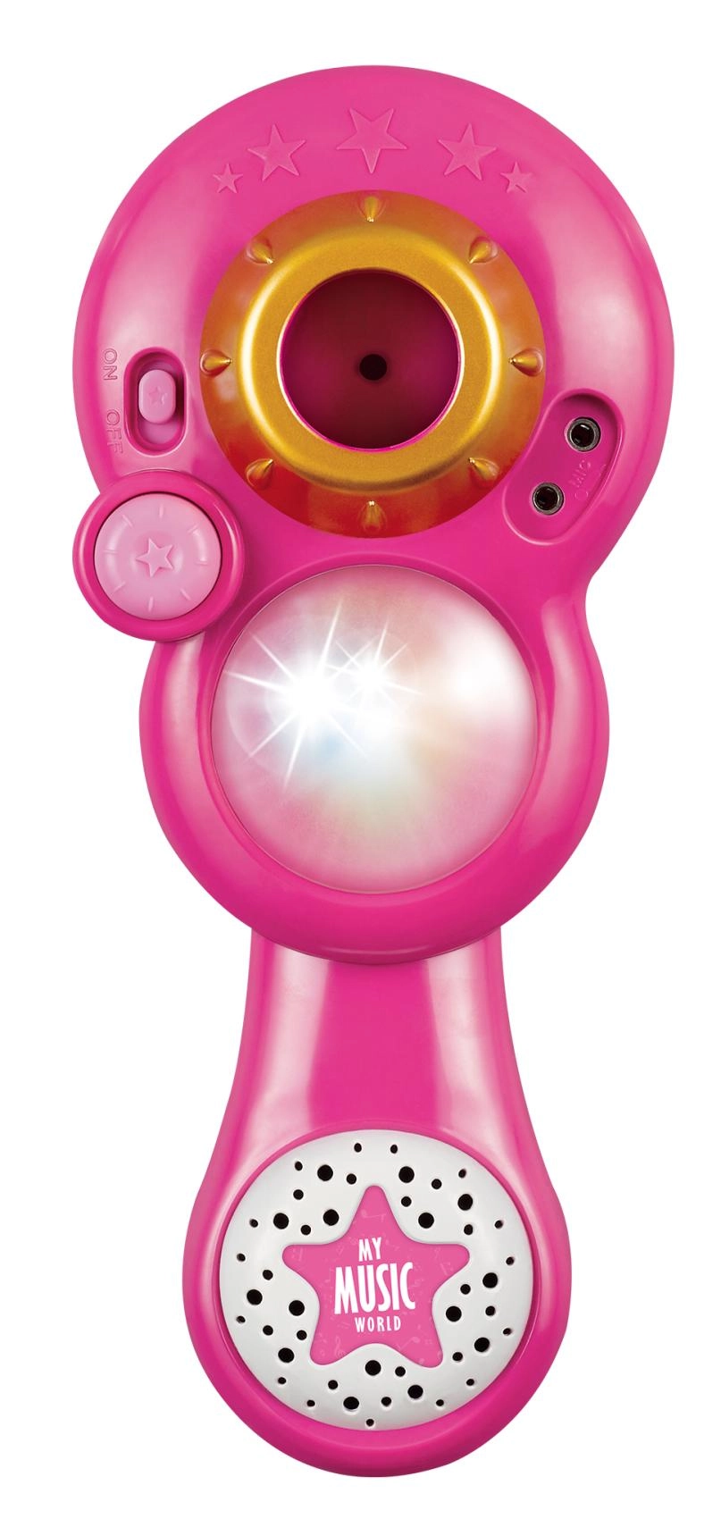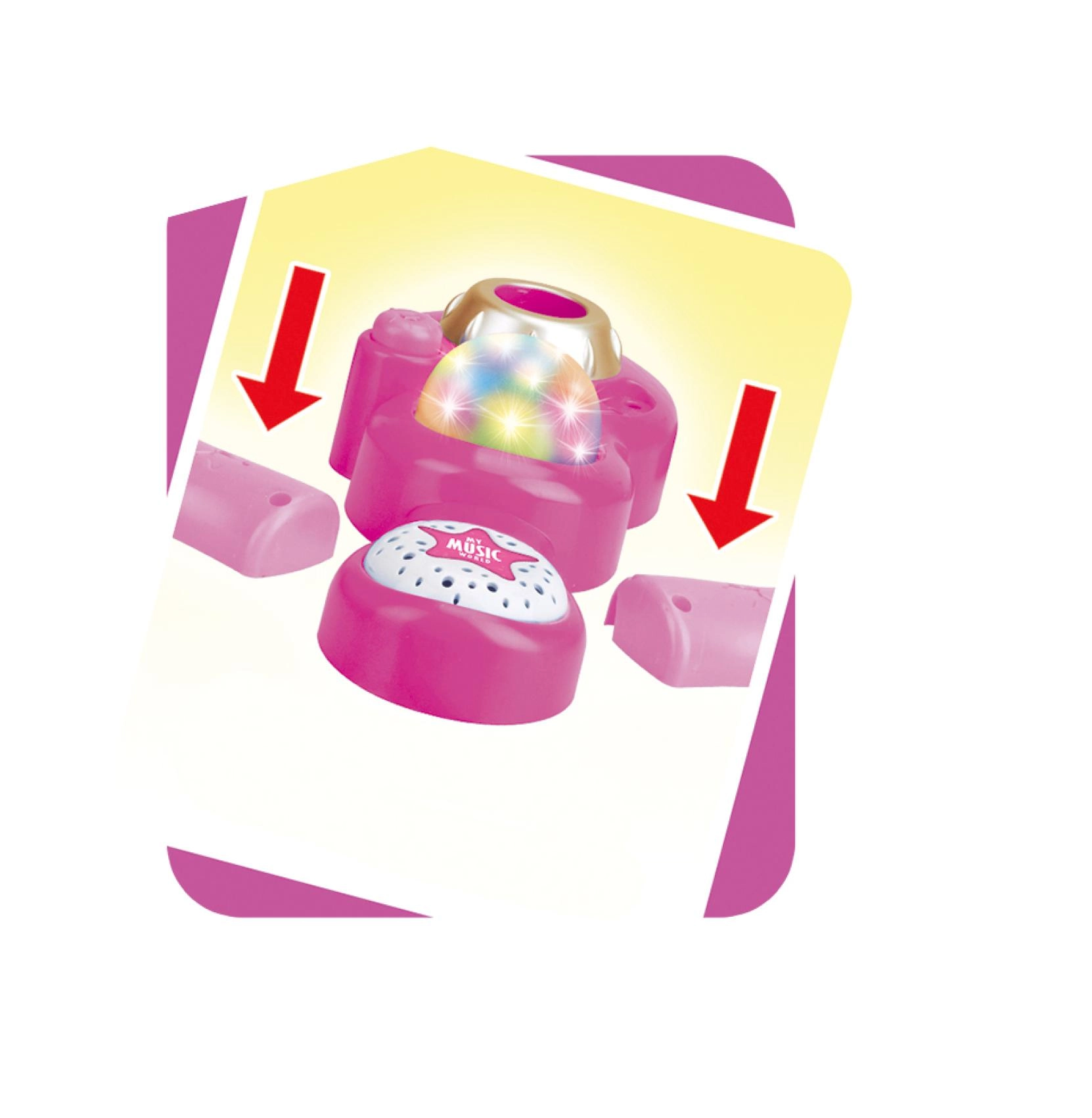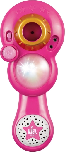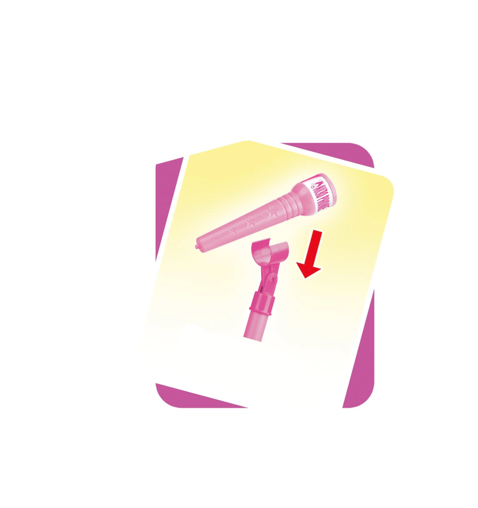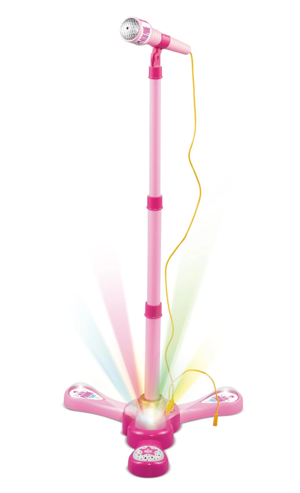 Organiza en casa un espectáculo de karaoke inolvidable. Este micrófono rosa con soporte trípode estable tiene llamativos efectos de luz y reproduce 12 canciones pregrabadas. Conecta fácilmente un reproductor MP3 o un teléfono móvil para poner los éxitos favoritos.