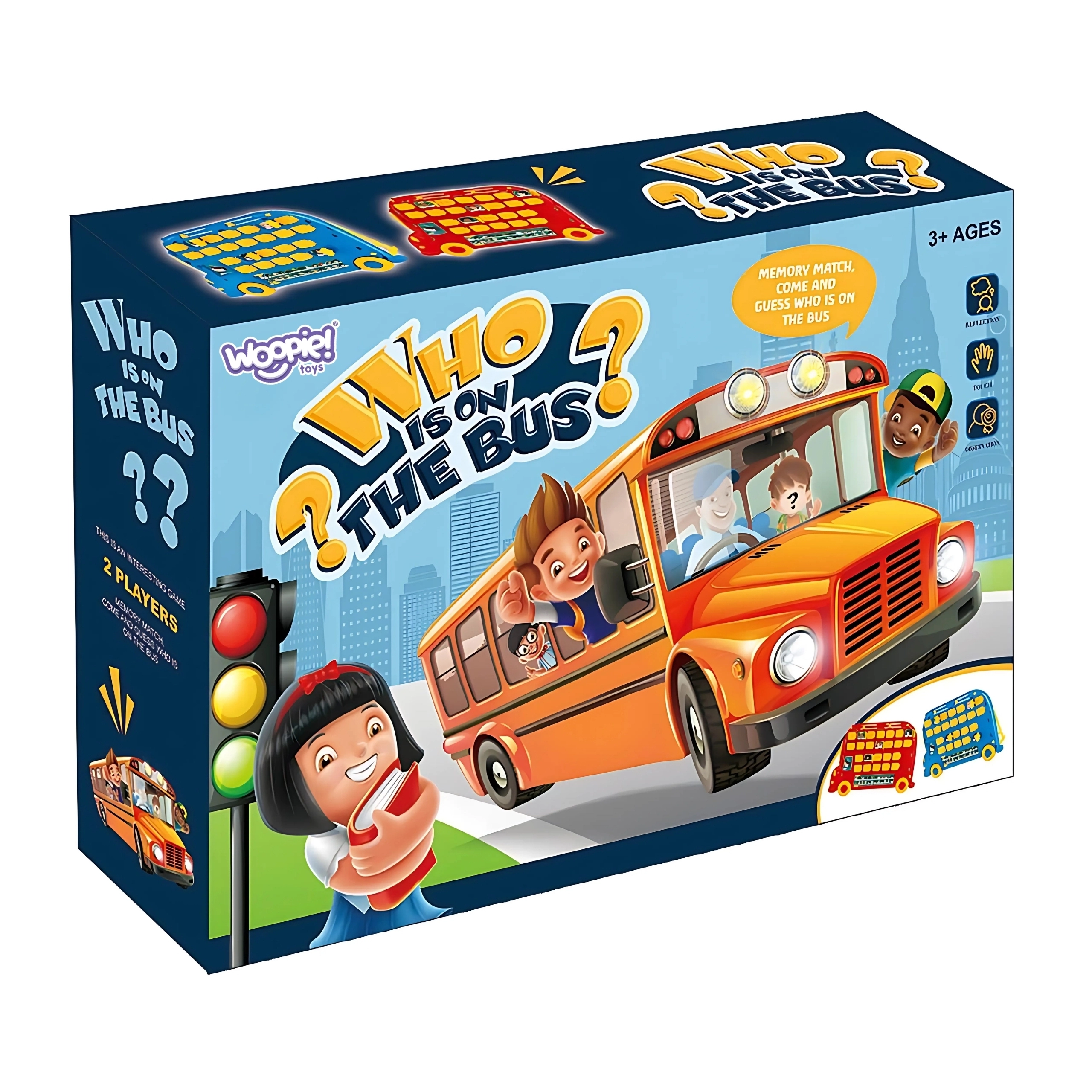 Descubre una diversión familiar renovada con Woopie Adivina quién. Dos tableros de juego estables con forma de autobús, ventanillas claras y tarjetas insertables de doble cara (personajes y animales) convierten el juego en una excelente herramienta para el desarrollo de la lógica, la concentración y las habilidades lingüísticas. Las reglas sencillas son aptas incluso para los más pequeños y, gracias a su mecanismo puramente mecánico, no se necesitan pilas.
