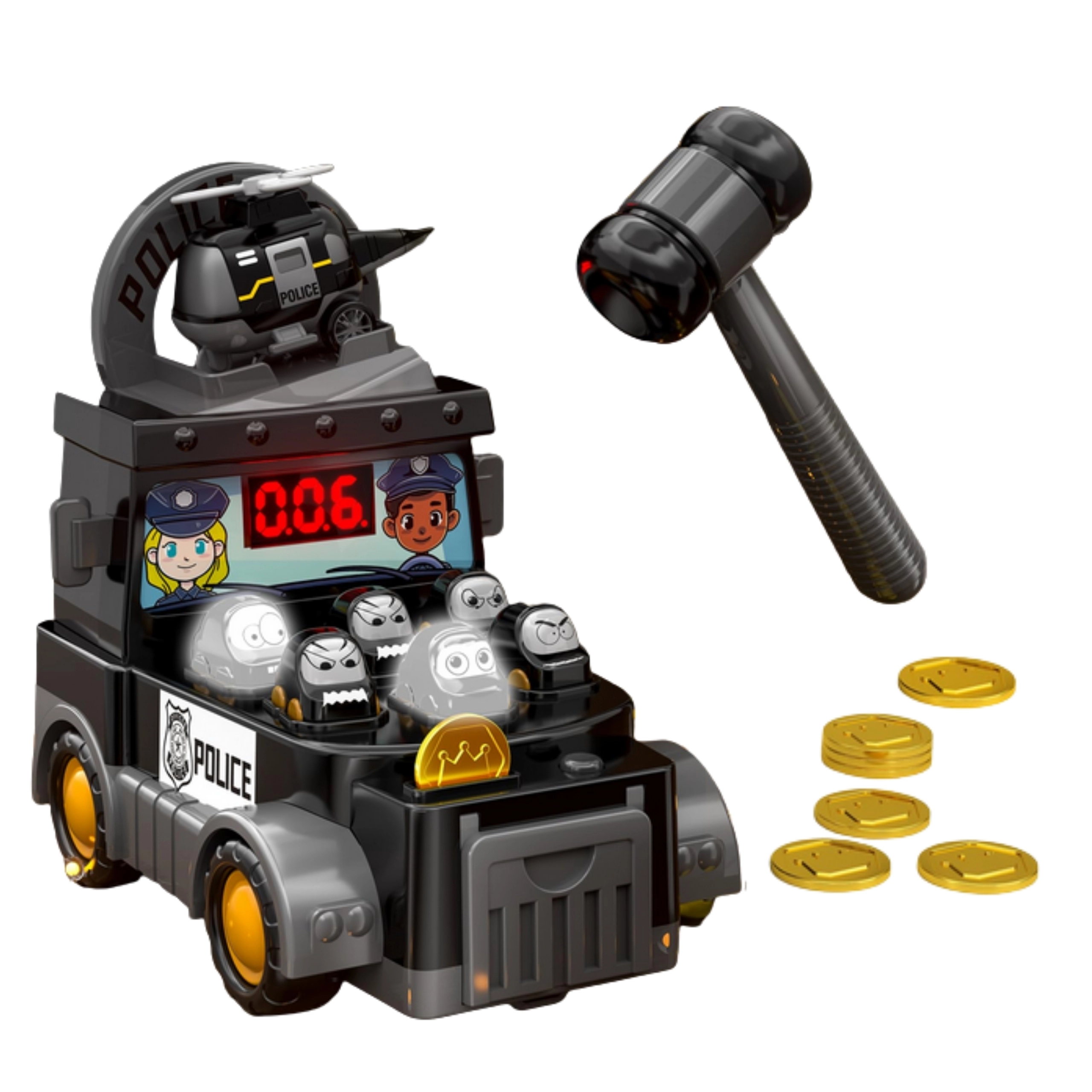 - Mini coche de policía, helicóptero, martillo, 6 monedas, coche de policía con aberturas