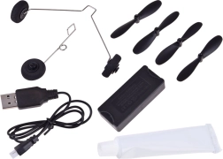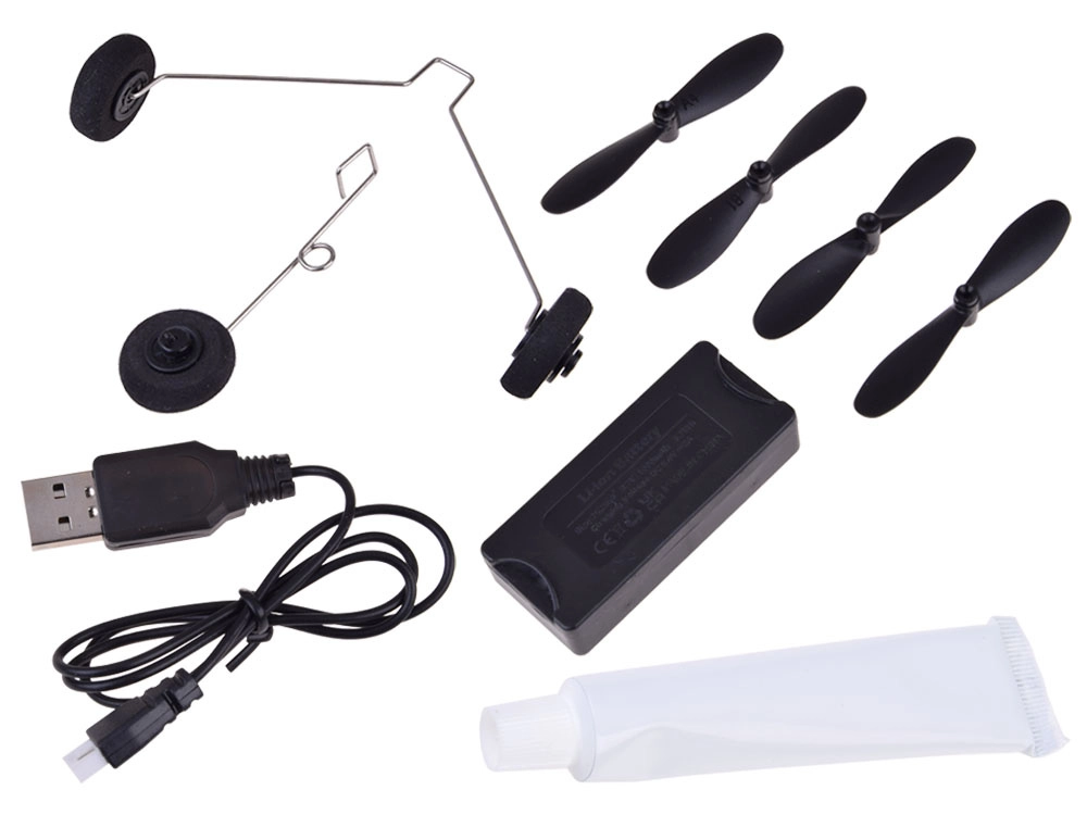 - Avión, 4× hélice, 2× estabilizador horizontal, 2× rueda, cable USB, mando a distancia, tubo de pegamento