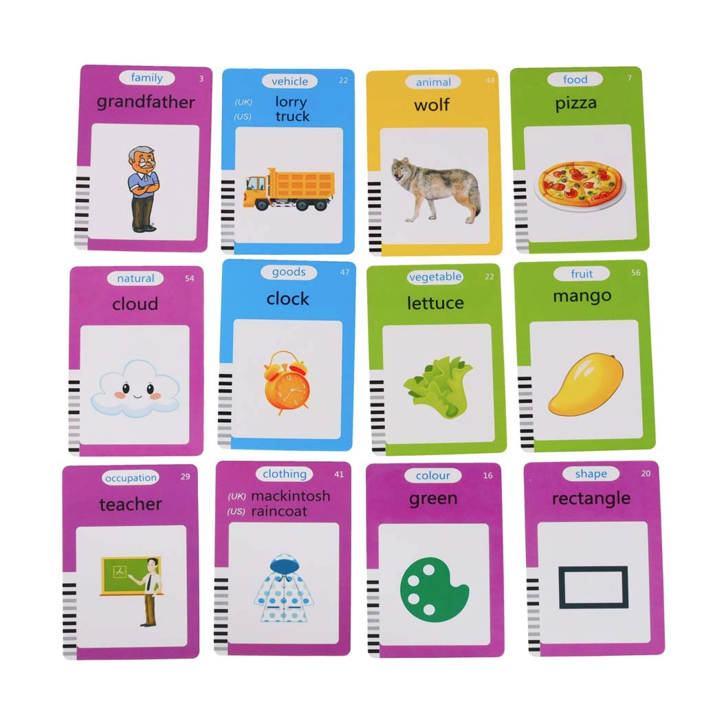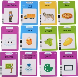 El aprendizaje es claro y motivador: 112 tarjetas de doble cara (224 imágenes) cubren temas como Animales, Vehículos, Objetos, Comida, Verduras, Frutas, Familia, Colores, Formas, Profesiones, Ropa y Naturaleza. El manejo práctico ofrece funciones de repetición, control de volumen, borrado y bloqueo de borrado. Su diseño ligero y la carga por USB garantizan un uso cómodo en cualquier lugar.