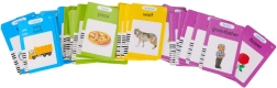 Un total de 224 imágenes en los temas: animales, vehículos, objetos, comida, verduras, frutas, familia, colores, formas, profesiones, ropa y naturaleza, ideal para el vocabulario.