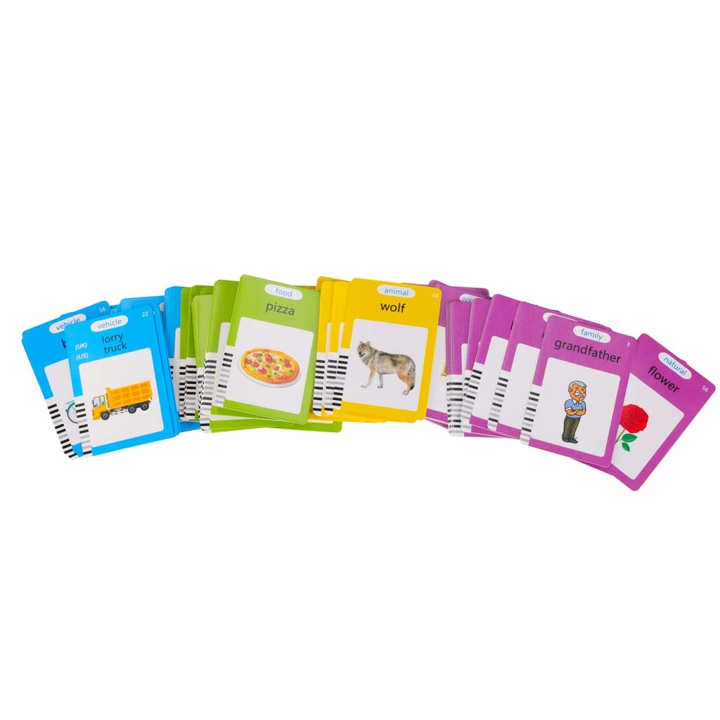 Inserta la tarjeta en el lector y escucha la pronunciación correcta en inglés. Las categorías de animales y vehículos incluyen sonidos realistas para facilitar aún más la memorización.