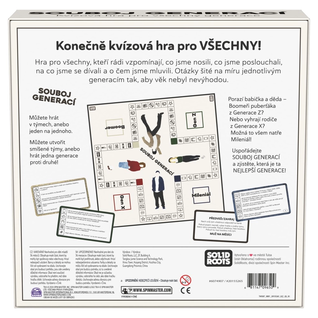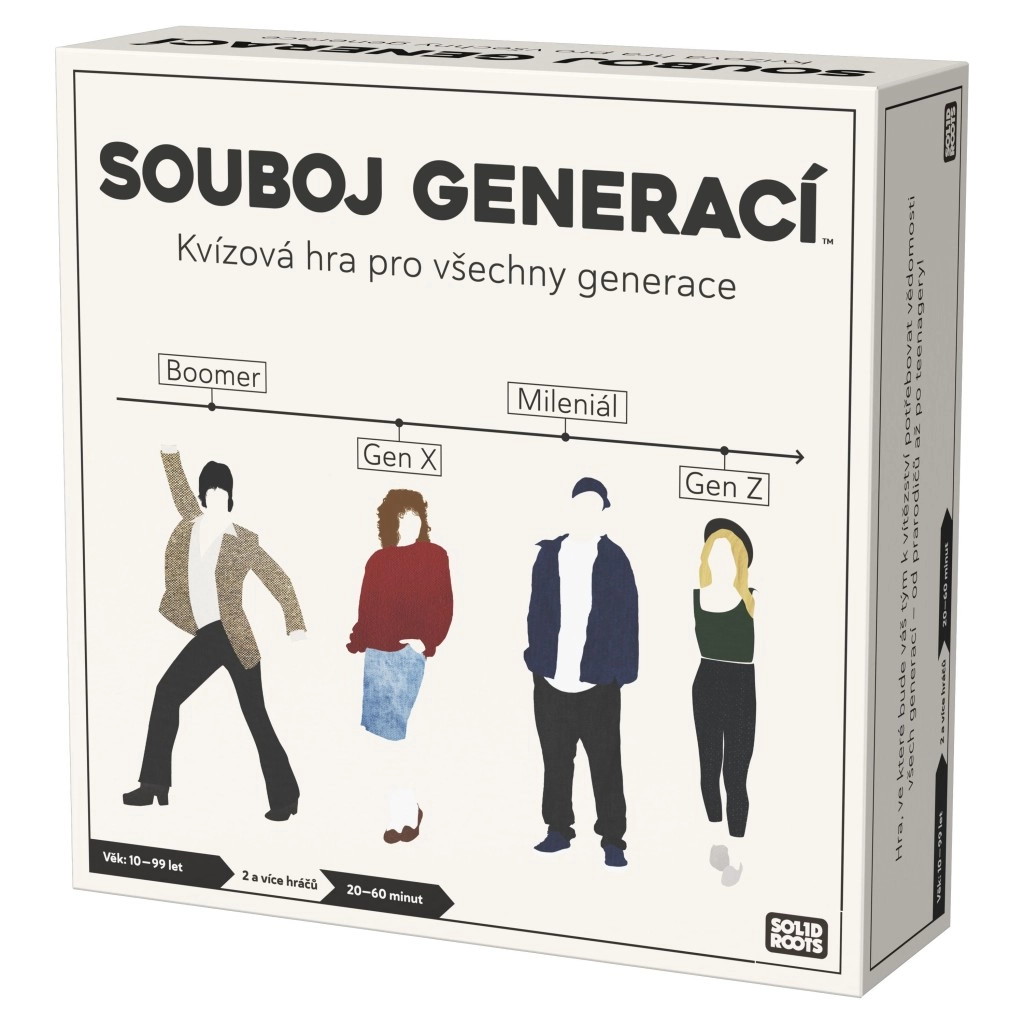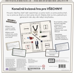 ¡Vive un emocionante duelo de conocimientos a través del tiempo! Este original juego de preguntas para 2 o más jugadores pondrá a prueba tus conocimientos de los últimos casi cien años. Las preguntas están divididas en cuatro periodos: Boomer, Generación X, Millennials, Generación Z, y se centran en historia, cultura, publicidad, moda y tendencias. Se juega individualmente o por equipos, y las cartas de Desafío pondrán a prueba tu ingenio y habilidades. Ideal para familias y fiestas, de 20 a 60 minutos, a partir de 10 años. Solo para el mercado checo.