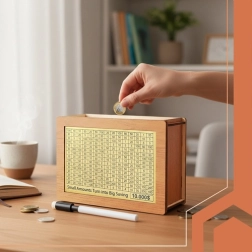 Hucha con estilo de madera natural en tono marrón‑beige que ofrece un objetivo de ahorro claro y motivación diaria. Gracias a las 5 tarjetas intercambiables con diferentes valores, podrás definir fácilmente tu propio reto e ir coloreando/marcando los campos hasta completarlo.