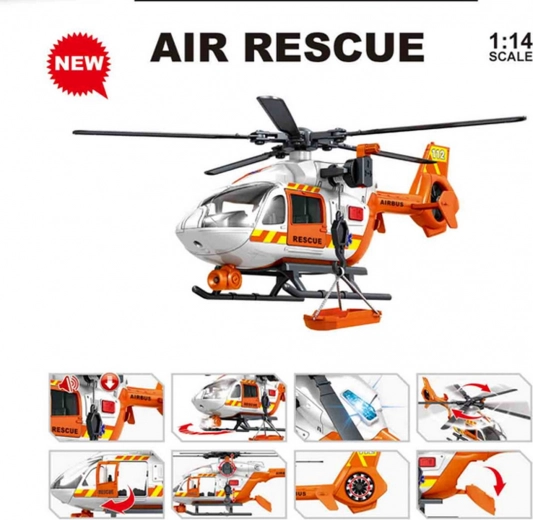 Este helicóptero de rescate, detallado a escala 1:14, encantará a los pequeños aficionados a las misiones de acción. Está hecho de plástico resistente con un diseño de colores atractivos y ofrece numerosas funciones realistas para horas de diversión.