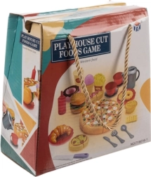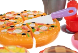 - Pizza, cortador de pizza, cuchillo, 2× perrito caliente, hamburguesa (panecillo, lechuga, filete), patatas fritas, kétchup, vaso con pajita, jarra, 2× taza con platillo, postres (molde, donut, rosquilla, 3× galleta), cubiertos (cuchara, cuchillo, tenedor), vajilla, manual
