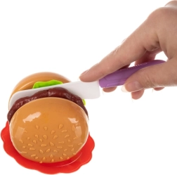 - 42 piezas en el paquete: pizza, cortador de pizza, cuchillo, 2× perrito caliente, hamburguesa (panecillo, lechuga, filete), patatas fritas, kétchup, vaso con pajita, jarra, 2× taza con platillo, postres (moldes, donut, rosquilla, 3× galleta), cubiertos (cuchara, cuchillo, tenedor), vajilla, manual.