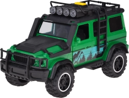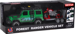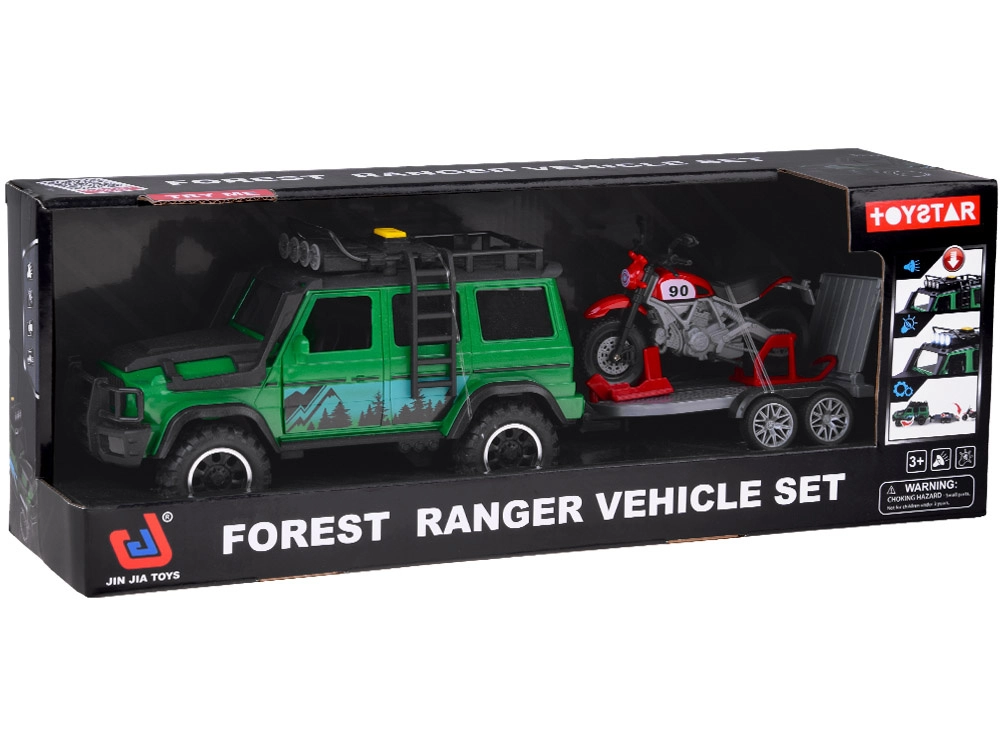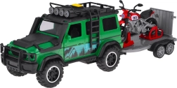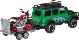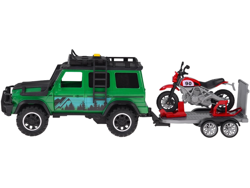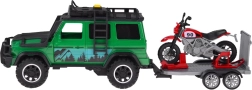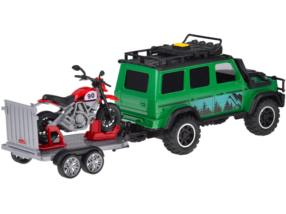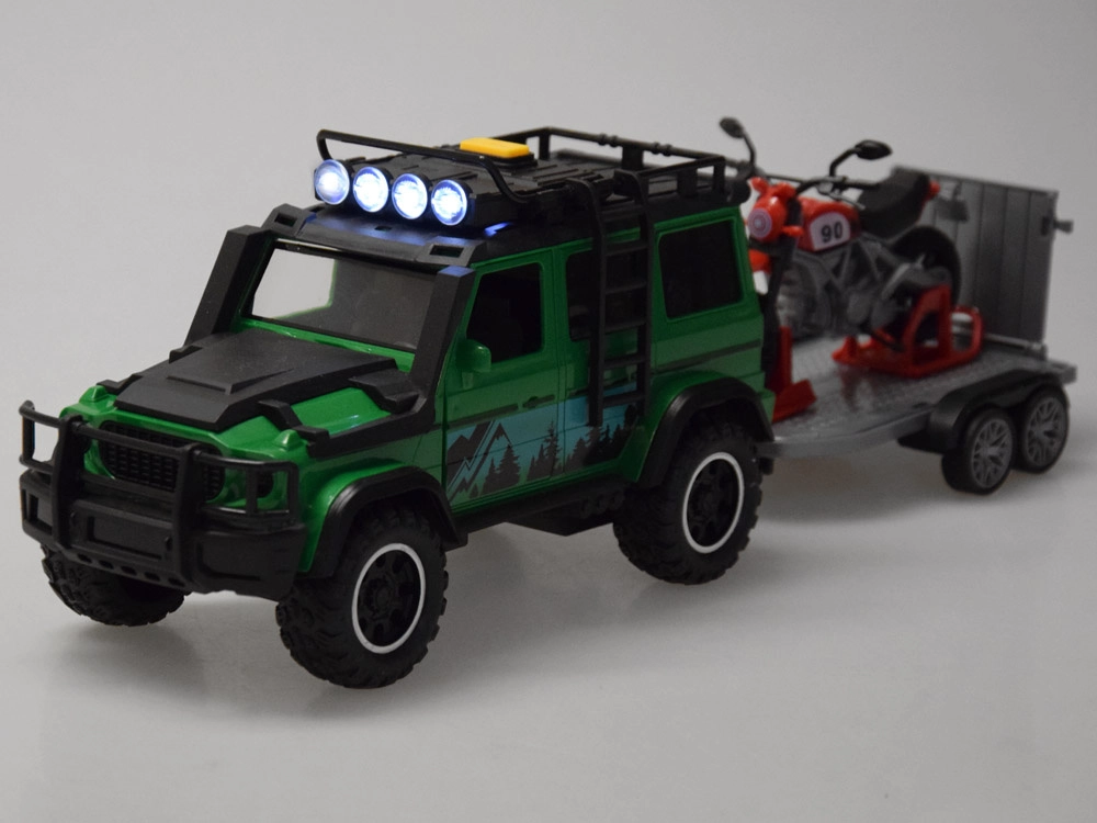 Set aventurero para pequeños conductores: todoterreno verde con remolque-plataforma desmontable y moto deportiva roja. El vehículo ofrece efectos de luz y sonido, puertas abatibles y ruedas de goma para una conducción fluida. El remolque cuenta con rampa trasera abatible para una carga fácil y un transporte seguro de la moto. Ideal para el juego creativo y para transportar otros juguetes favoritos.
