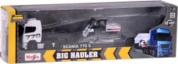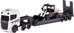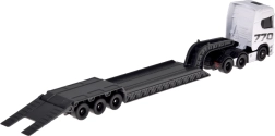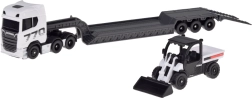 Descubre el conjunto realista SCANIA 770S con remolque de cama baja y cargador funcional, que destaca por su fiel nivel de detalle y una atractiva combinación en blanco y gris. El chasis metálico de la cabina y las piezas de plástico de alta calidad garantizan durabilidad incluso con uso frecuente.