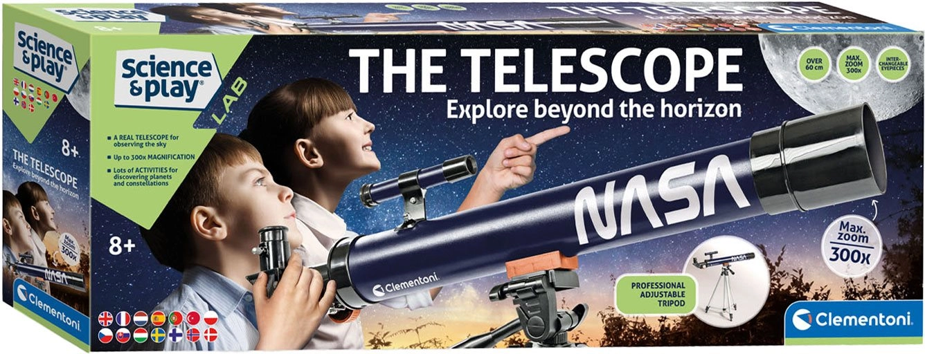 Explora el cielo nocturno con el telescopio infantil CLEMENTONI de la serie Science & Play. Este telescopio astronómico de calidad, inspirado en la NASA, ofrece aumentos de 50× hasta 100×, complementados con lente Barlow para un triple aumento. Gracias al objetivo de 50 mm y al trípode robusto de hasta 130 cm, es ideal para las primeras observaciones de la Luna, estrellas y planetas. Incluye una guía ilustrada que explica a los niños los fundamentos de la astronomía. A partir de 8 años, una excelente juguete STEM para aprender y divertirse.