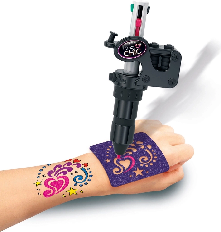 Descubre el mundo de los tatuajes temporales con el set creativo Crazy Chic. El set ofrece todo lo necesario para crear diseños originales: a mano alzada, con plantillas y con sellos. Gracias a los distintos colores, purpurina y su fácil uso, crear tatuajes es divertido, seguro y lleno de creatividad.