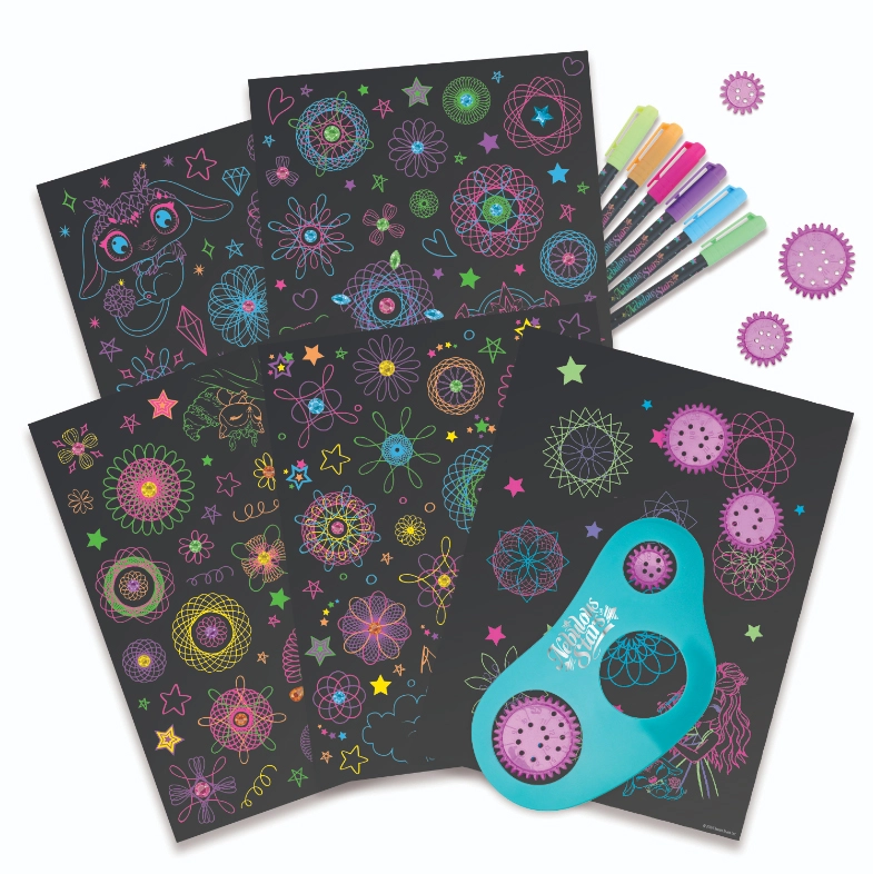 - Fácil y divertido: introduce la rueda en la plantilla, dibuja con un bolígrafo neón y observa cómo nacen fascinantes espirales.