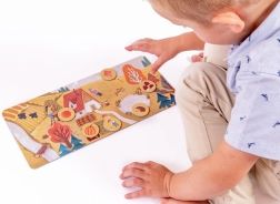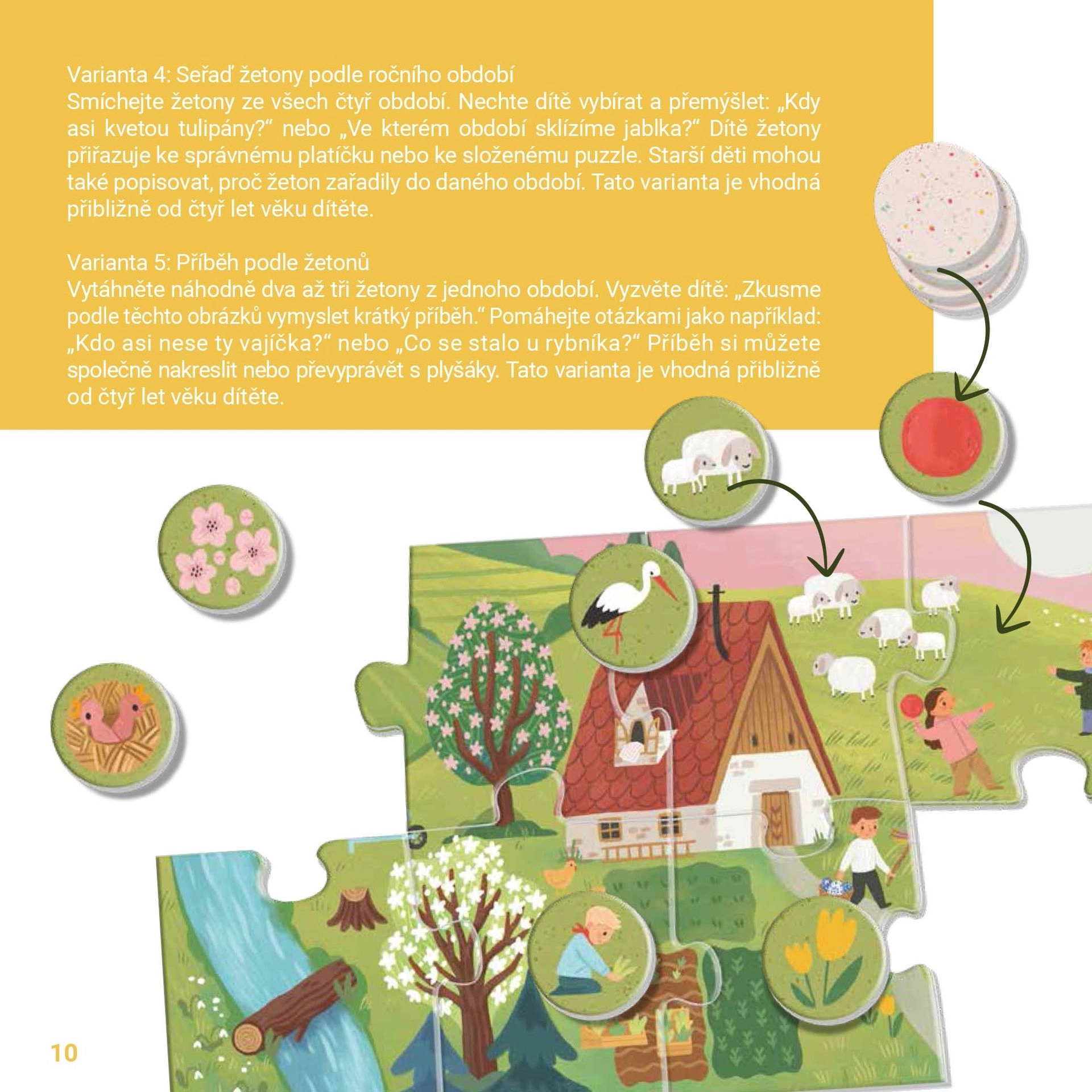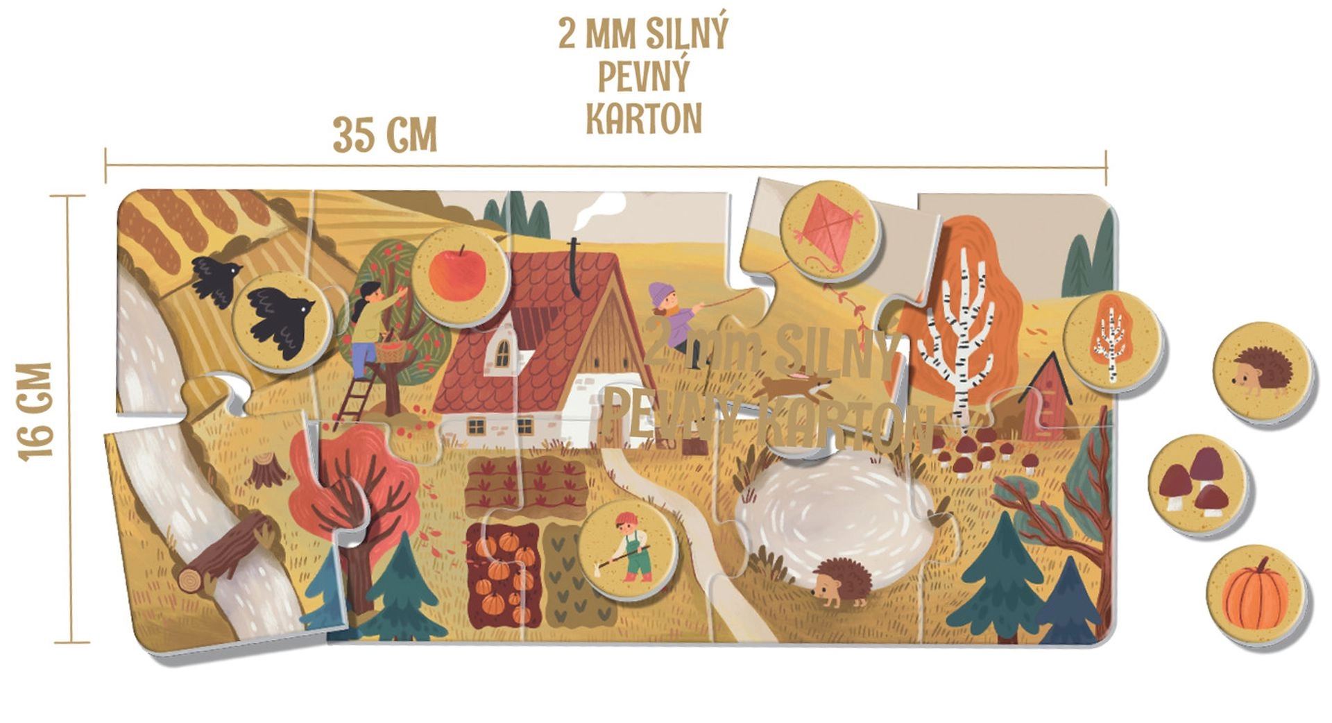 El juego está diseñado para manos pequeñas: las piezas extragrandes de cartón FSC de 2 mm son resistentes, fáciles de agarrar y totalmente libres de plástico. El aprendizaje ocurre de forma natural: los niños entrenan la atención, amplían el vocabulario y conversan sobre los cambios en la naturaleza durante el año.