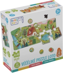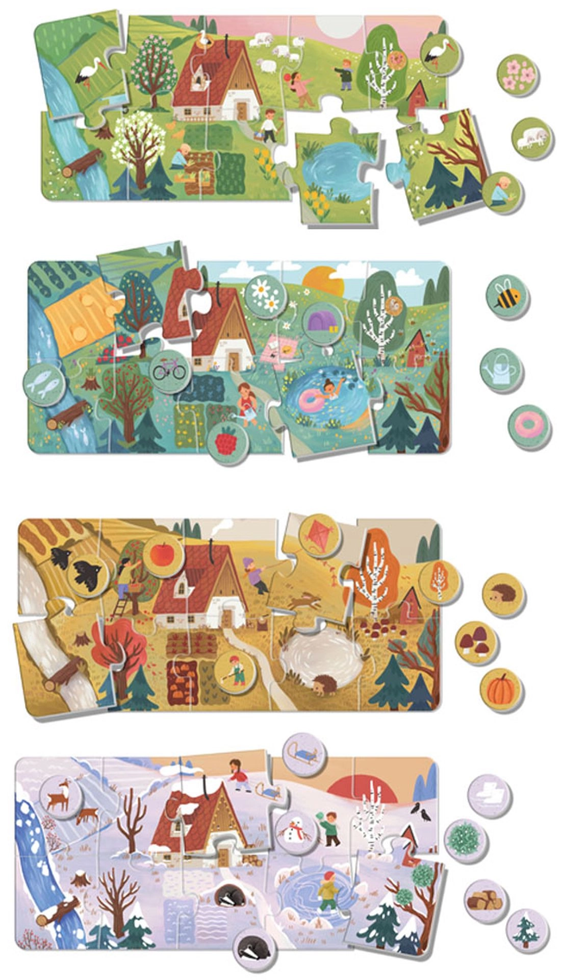 El gran loto de rompecabezas de las estaciones KukiKuk ofrece a los niños cuatro bellas escenas: primavera, verano, otoño e invierno. Cada estación se monta con 10 piezas grandes y después se asignan 8 fichas redondas con motivos típicos. Siguiendo los principios Montessori, los niños descubren, clasifican y conectan elementos según la percepción sensorial.