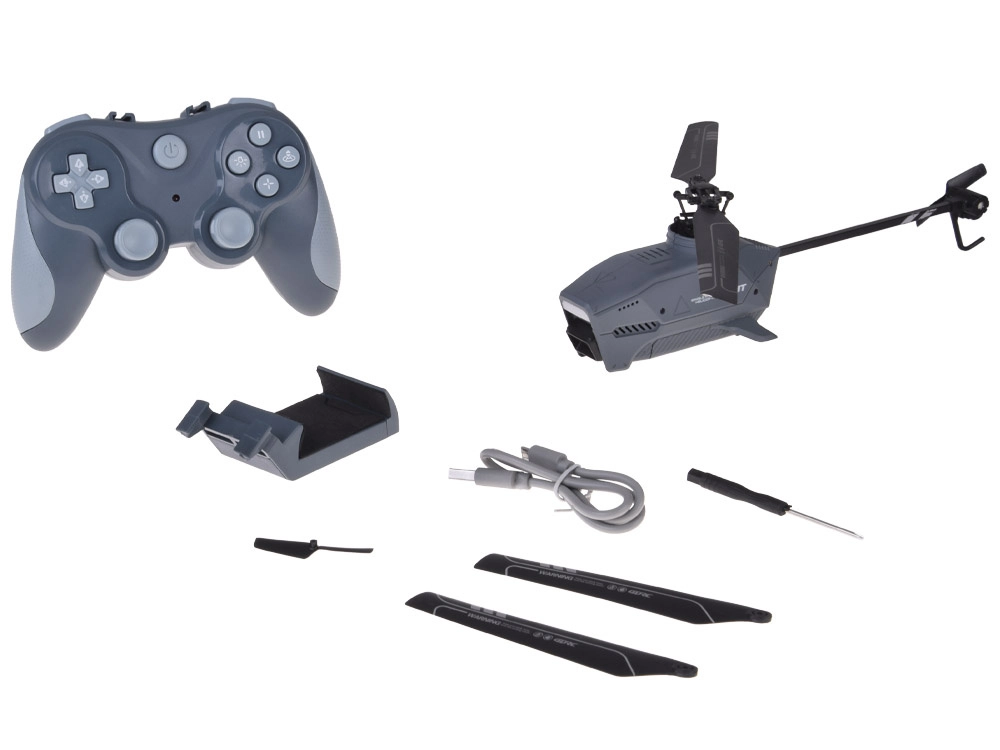 - Helicóptero, control remoto, batería, cable USB, palas de repuesto, rotor de cola, soporte para teléfono, destornillador, manual
