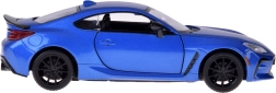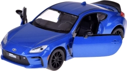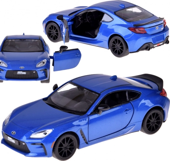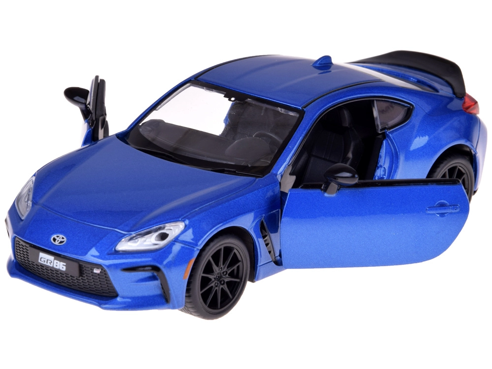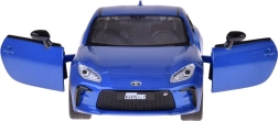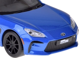 Modelo detallado del TOYOTA GR86 en atractivo azul metalizado que destaca por su calidad y proporciones realistas. La carrocería metálica con chasis de plástico y las ruedas de goma aseguran un movimiento fluido y silencioso, mientras que las puertas abatibles activan las luces y los sonidos del motor y el claxon.